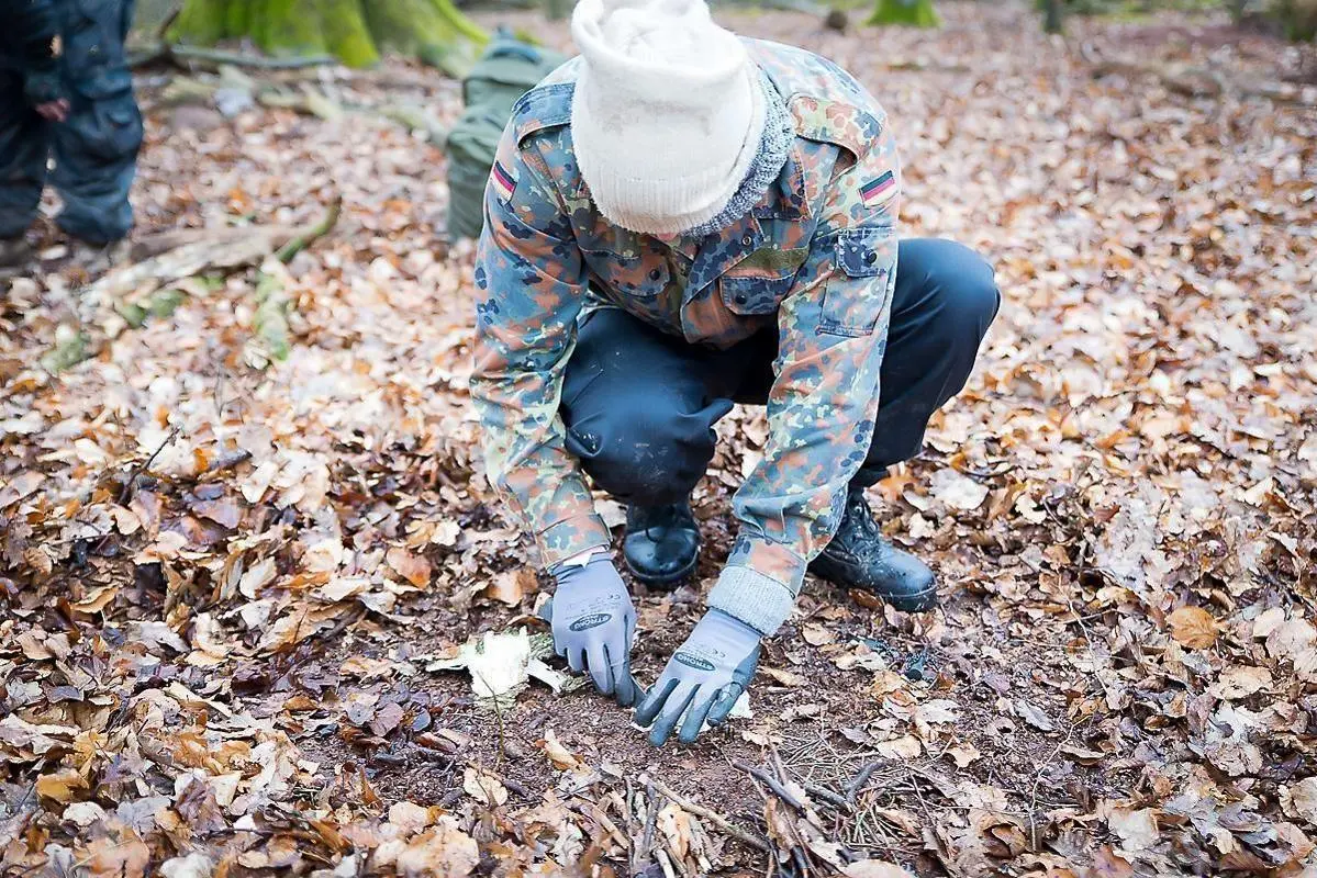 Person in camouflagierter Jacke hält andere Person am Arm im Wald