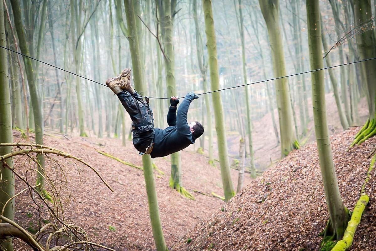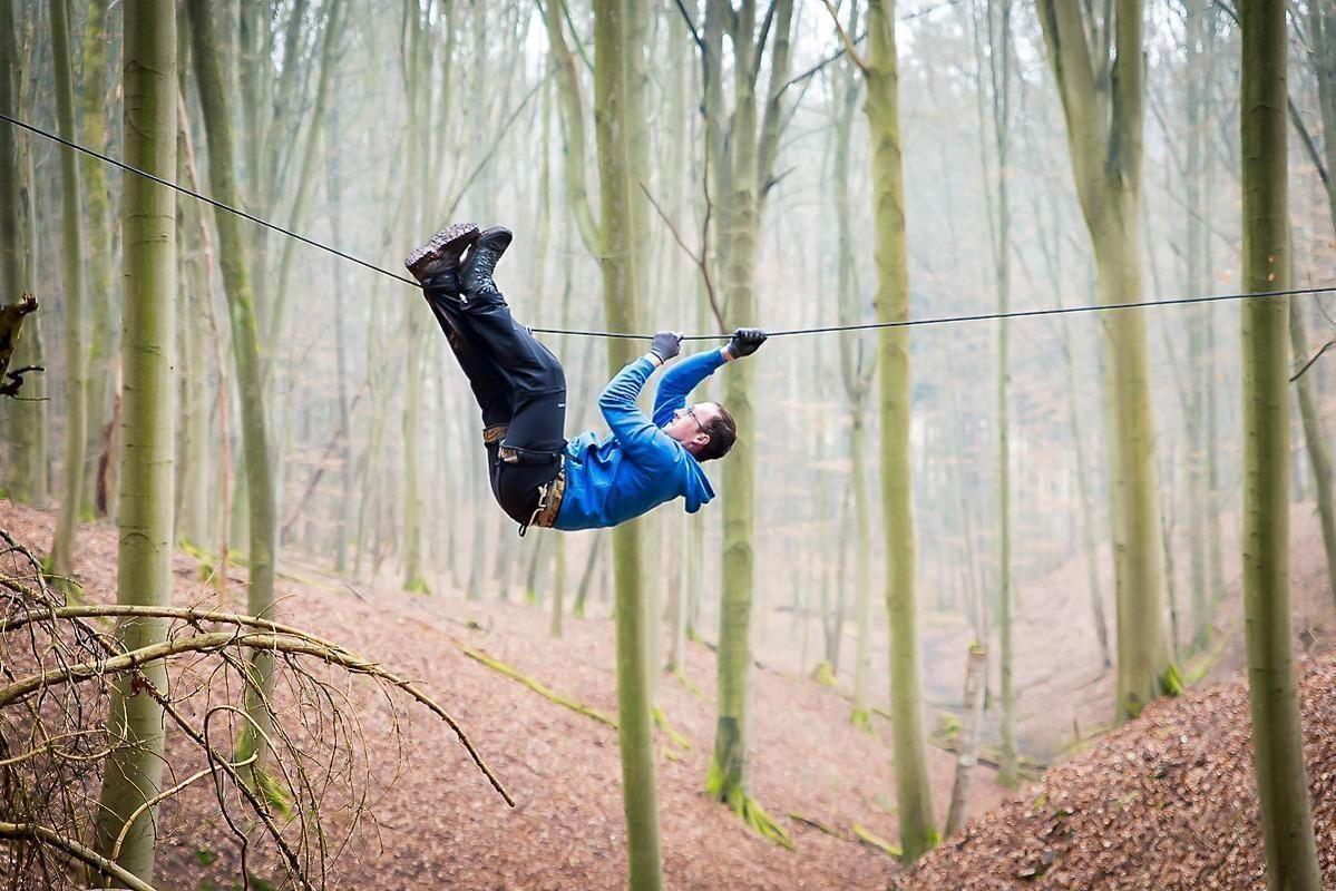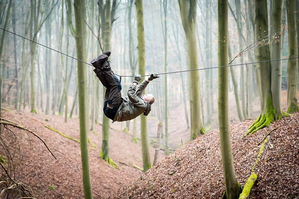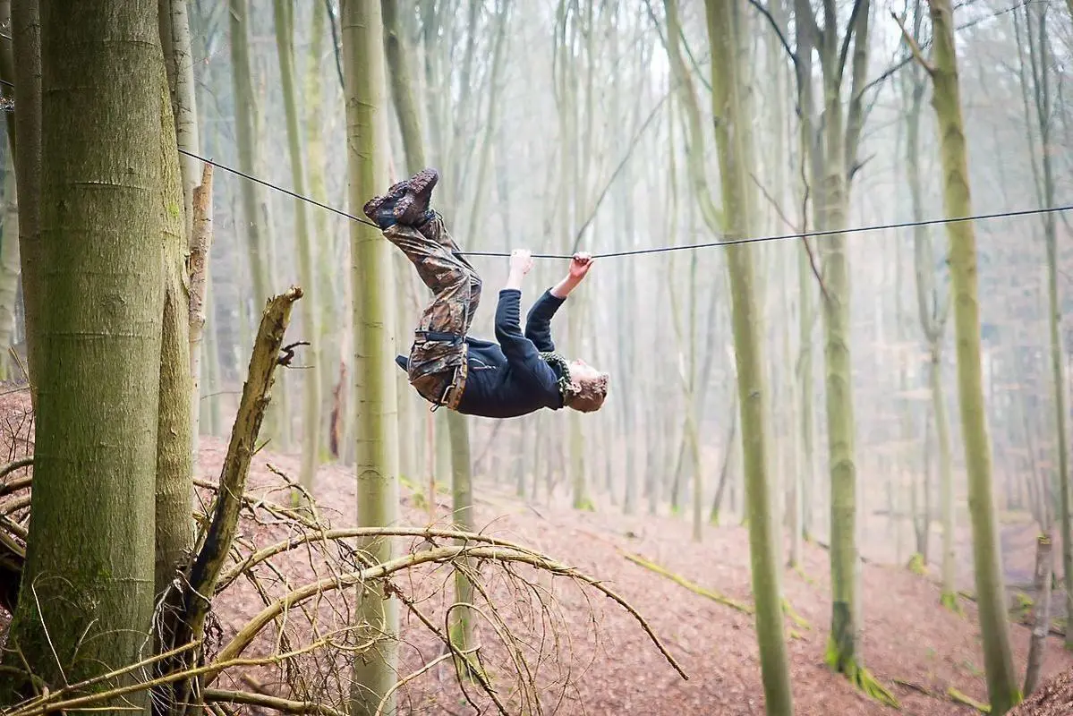 Seilquerung über einen Waldweg, Person hängt kopfüber an einem Seil