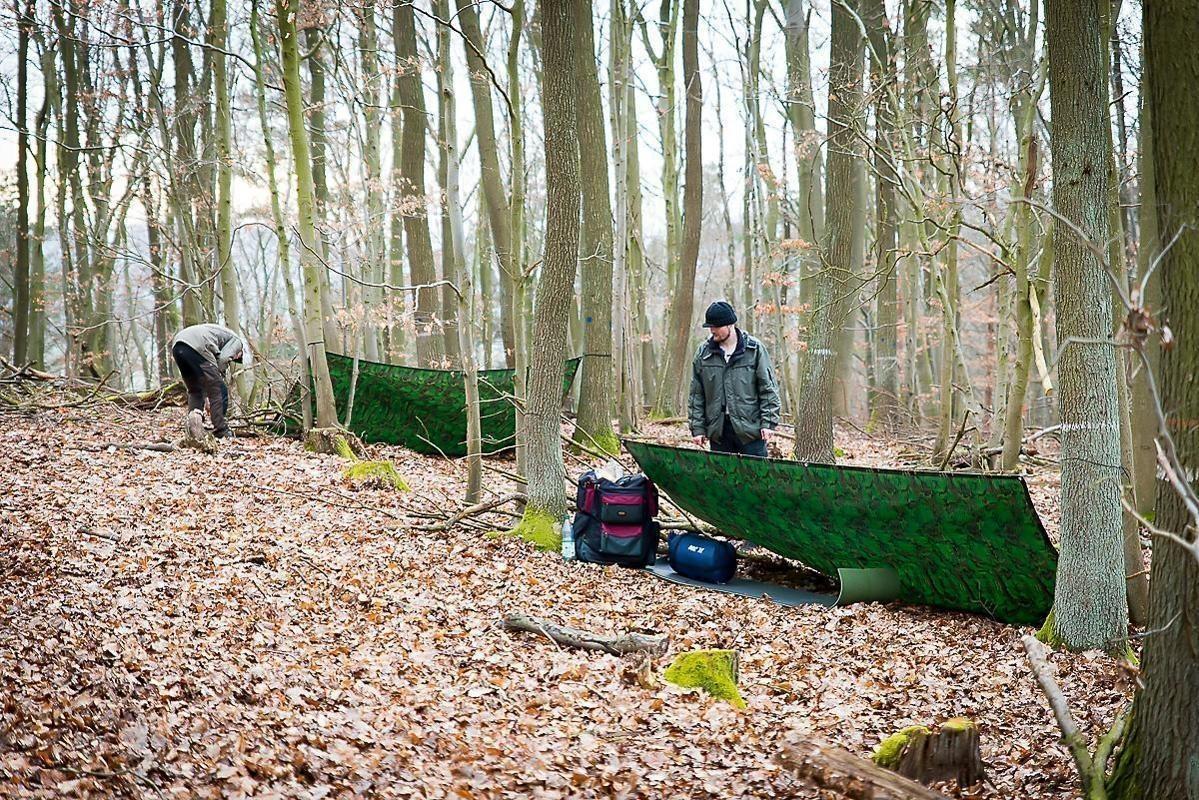 Zwei Personen bauen eine Tarp-Notunterkunft im Wald auf