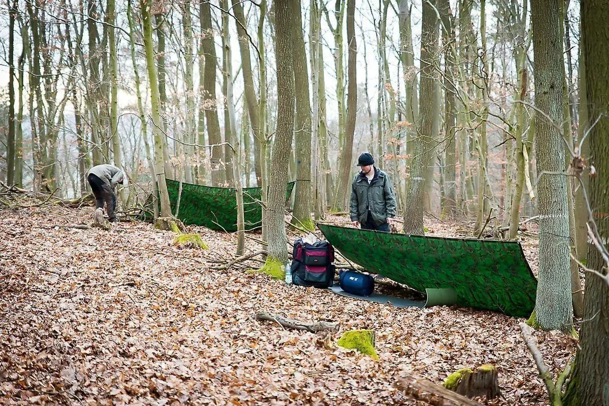 Zwei Personen bauen Tarp-Notunterkünfte im Wald auf