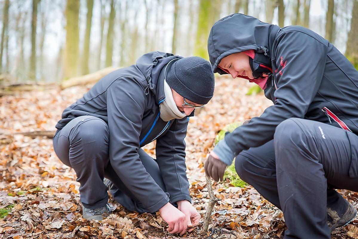 Zwei Personen knien im Laub und bearbeiten einen Stock im Wald