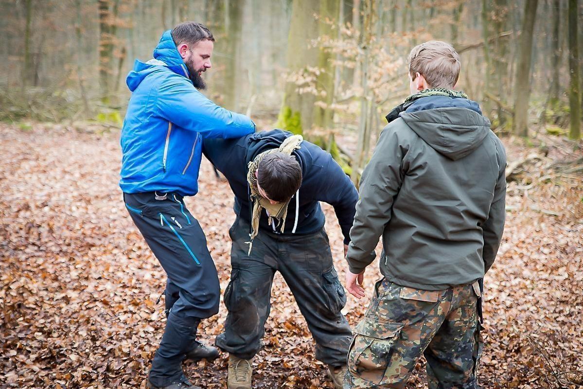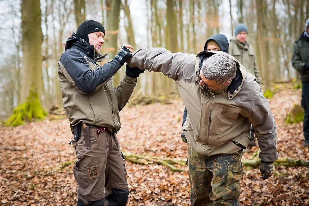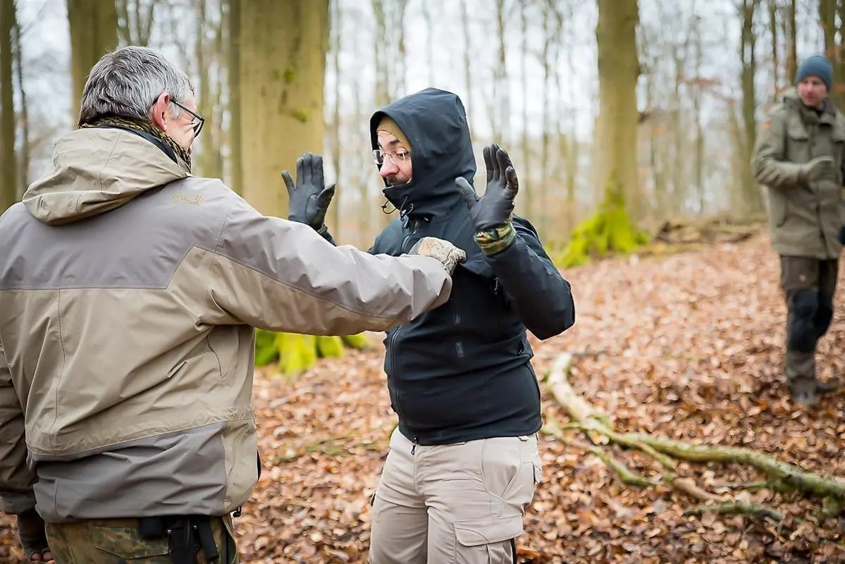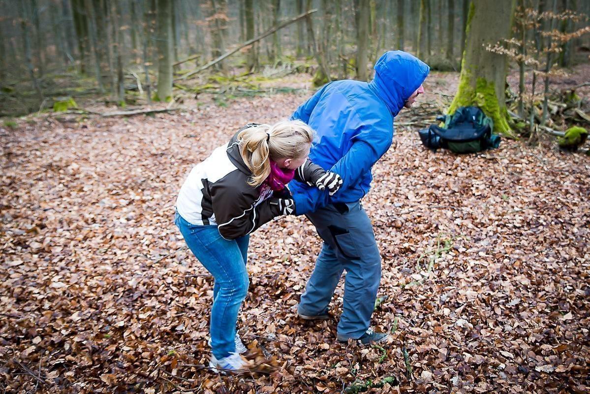 Zwei Personen üben eine Technik zur Selbstverteidigung im Laubwald