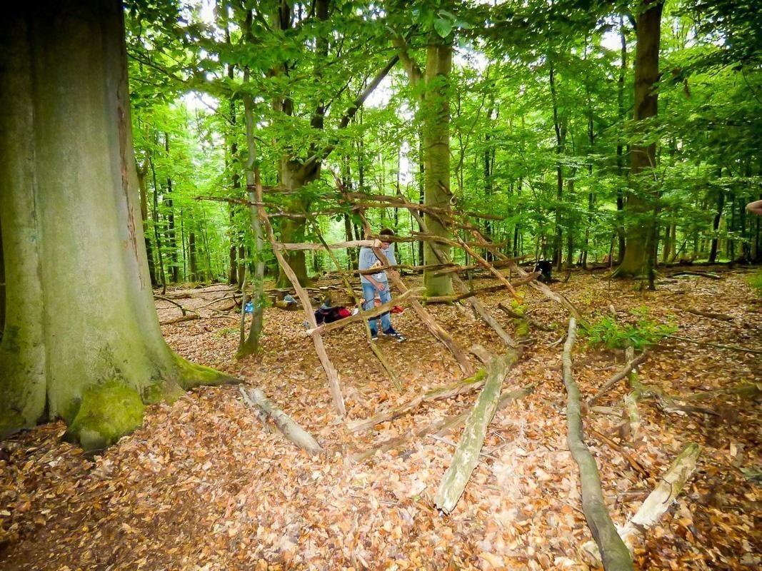 Zwei Personen bauen eine selbstgebaute Konstruktion aus Ästen im Wald