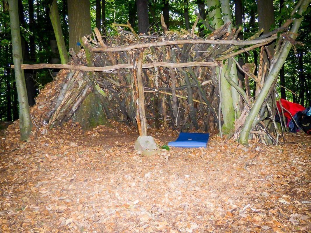 Selbstgebaute Laubhütte aus Ästen und Zweigen im Wald mit einer Matte im Inneren