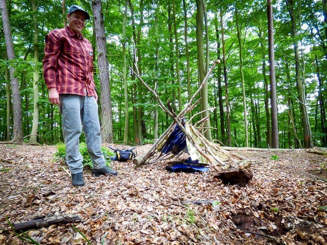 Mann baut eine selbstgebaute Konstruktion aus Ästen im Wald