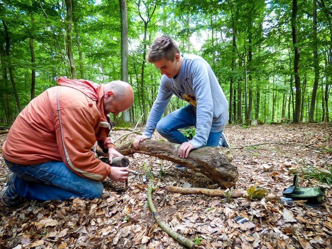 Zwei Personen bearbeiten einen Stein im Wald mit einem Werkzeug