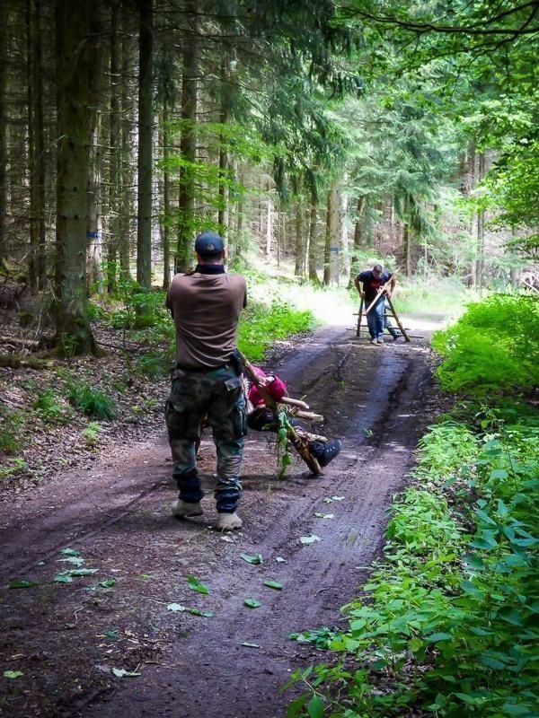 Zwei Personen arbeiten an einer improvisierten Trage auf einem Waldweg