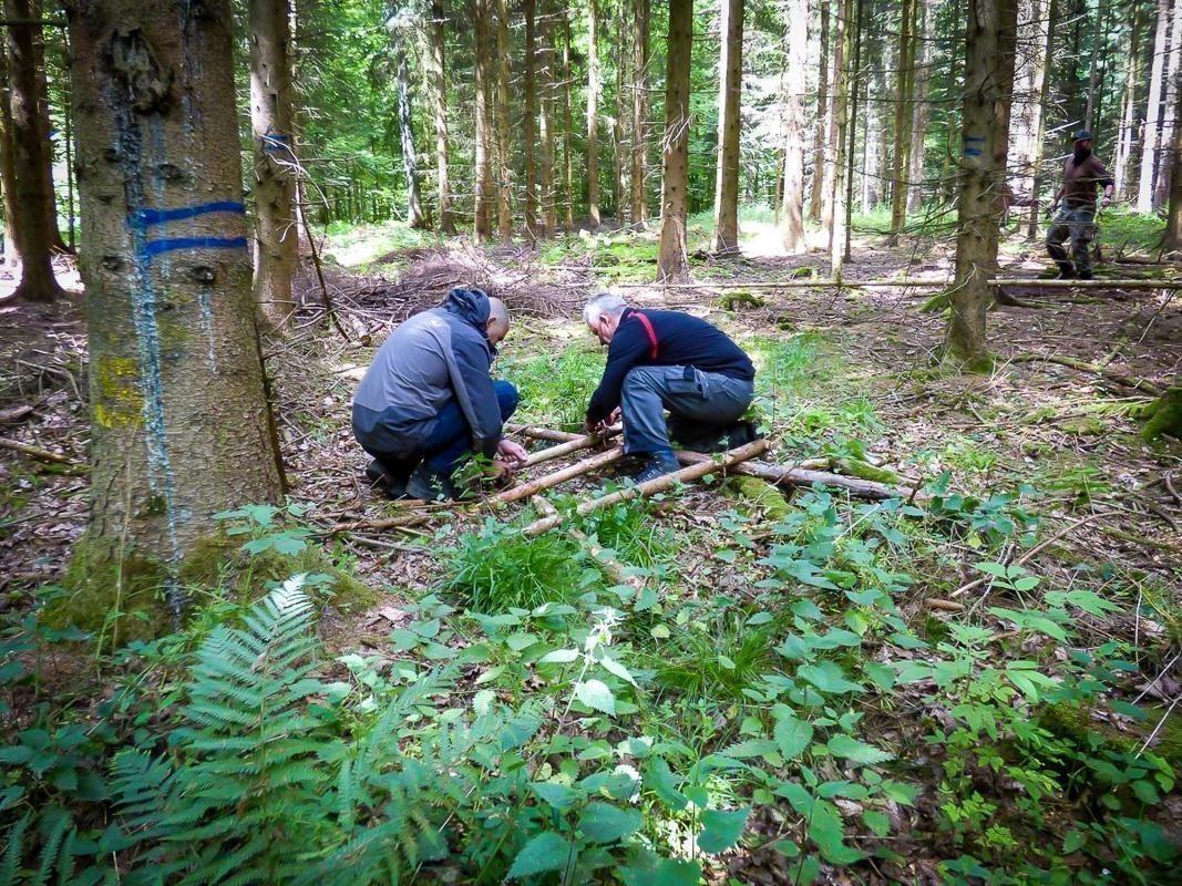 Zwei Personen arbeiten an einer Holzstruktur im Wald, eine Person hält einen Stock
