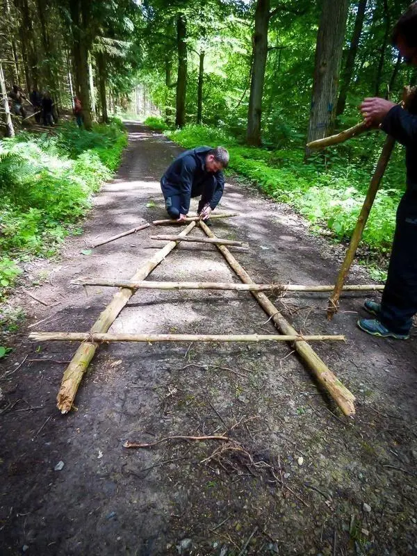 Gruppe arbeitet an einer improvisierten Trage aus Ästen im Wald