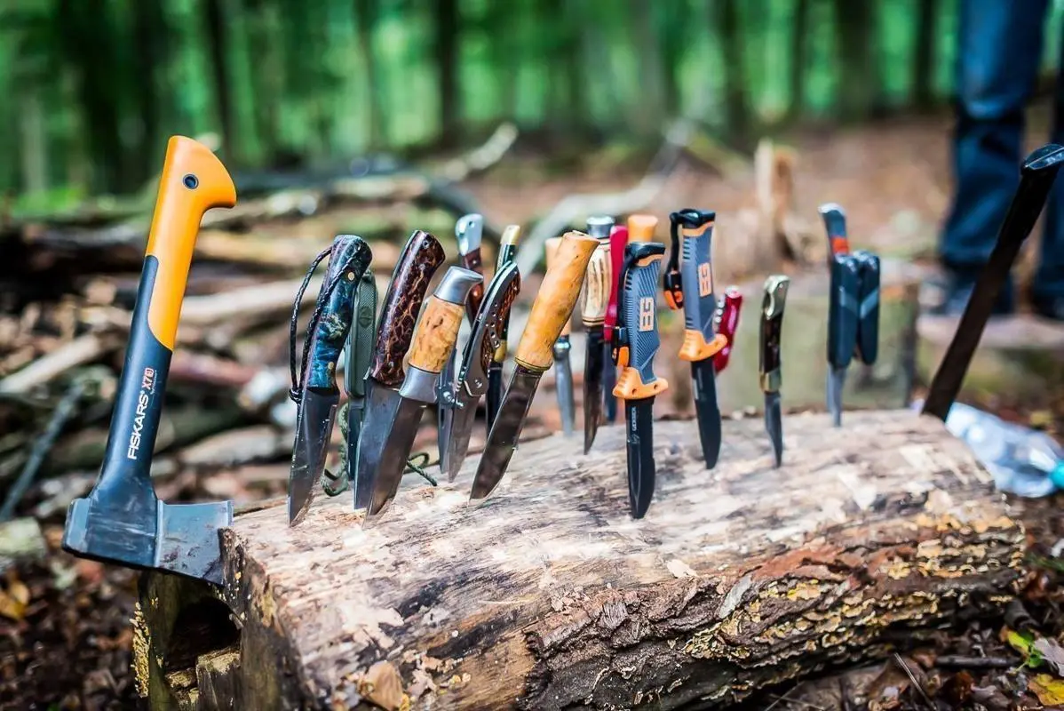 Axt und verschiedene Messer stehen auf einem Holzstamm im Wald