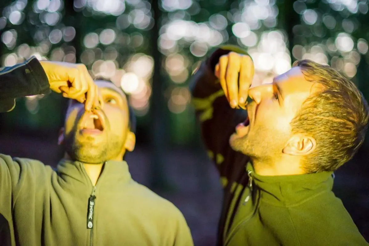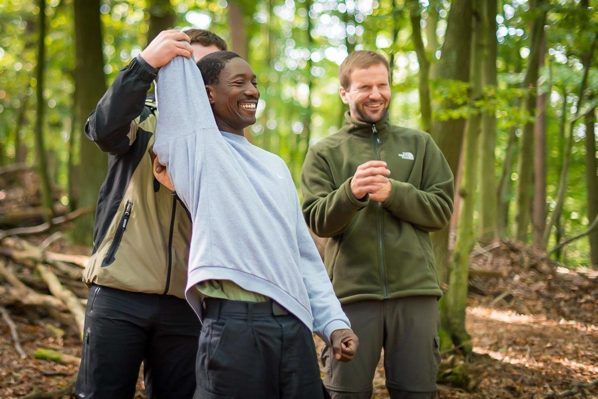 Gruppendynamik im Wald, eine Person hält einen anderen fest, während weitere Teilnehmer im Hintergrund stehen