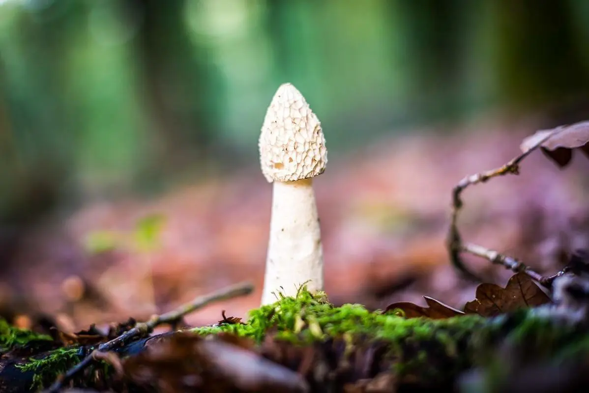 Ein einzelner Pilz wächst aus dem moosbedeckten Boden im Wald
