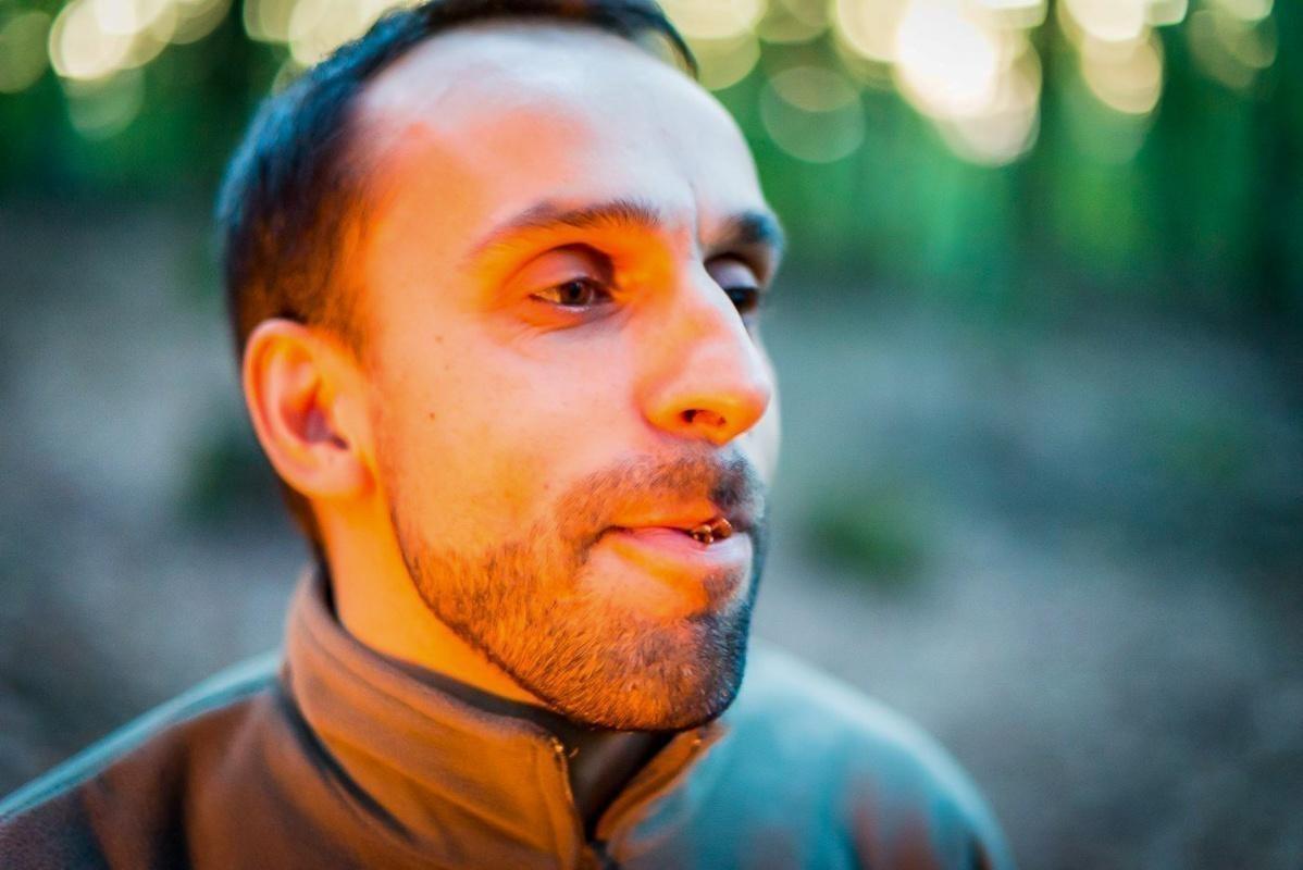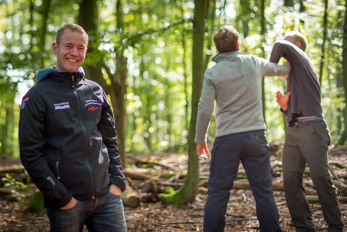Lächelnder Mann steht im Wald, während zwei Personen eine Auseinandersetzung simulieren