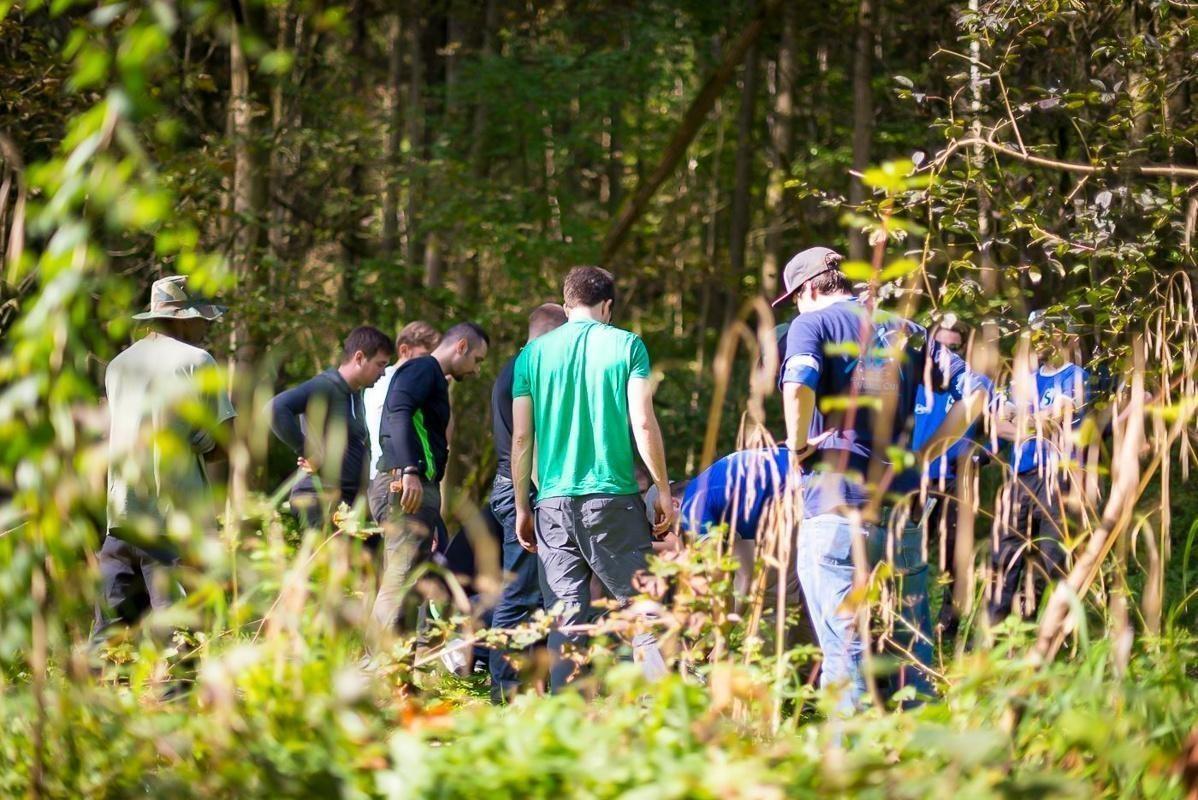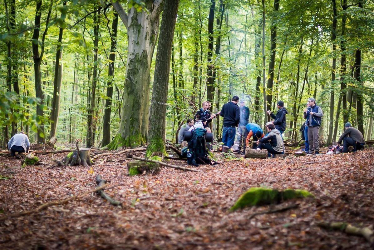 Gruppierung von Personen im Wald, die sich um einen Bodenbereich versammeln