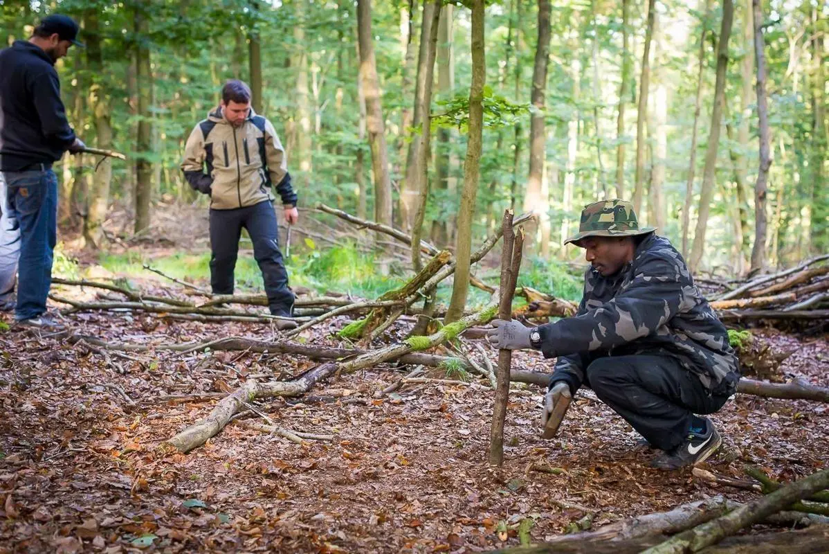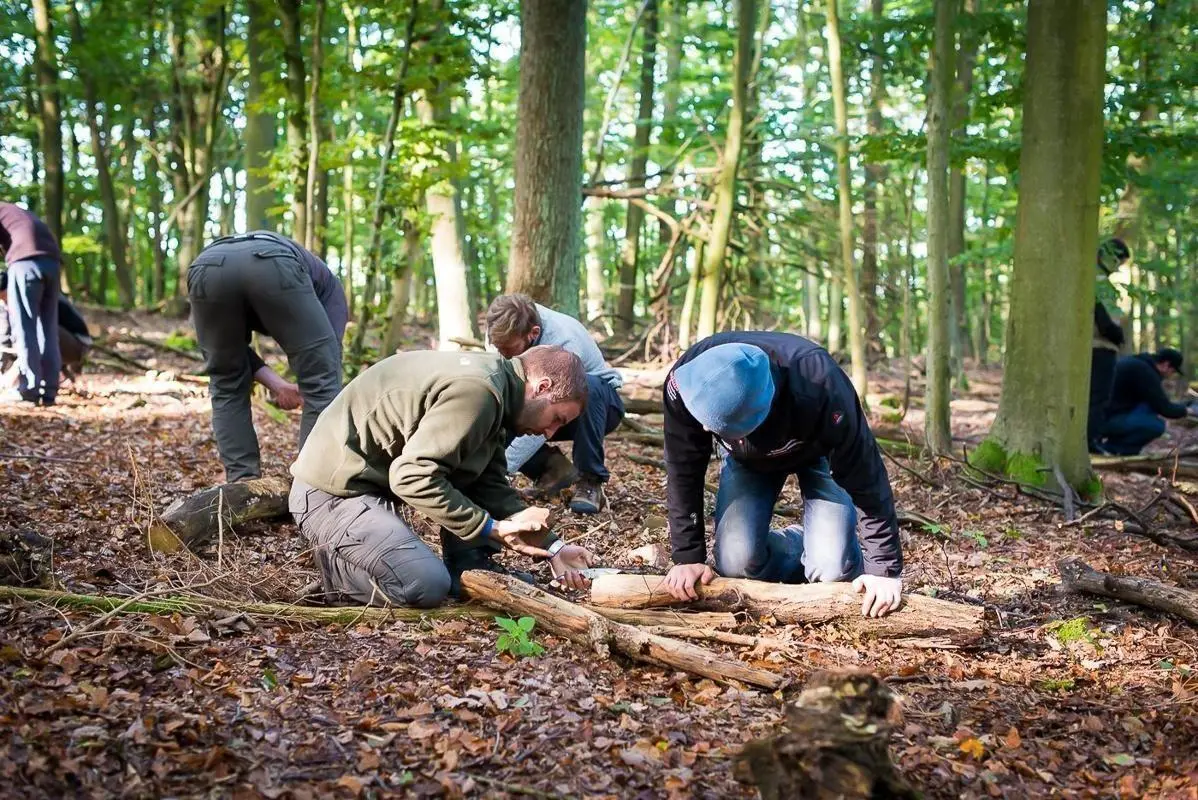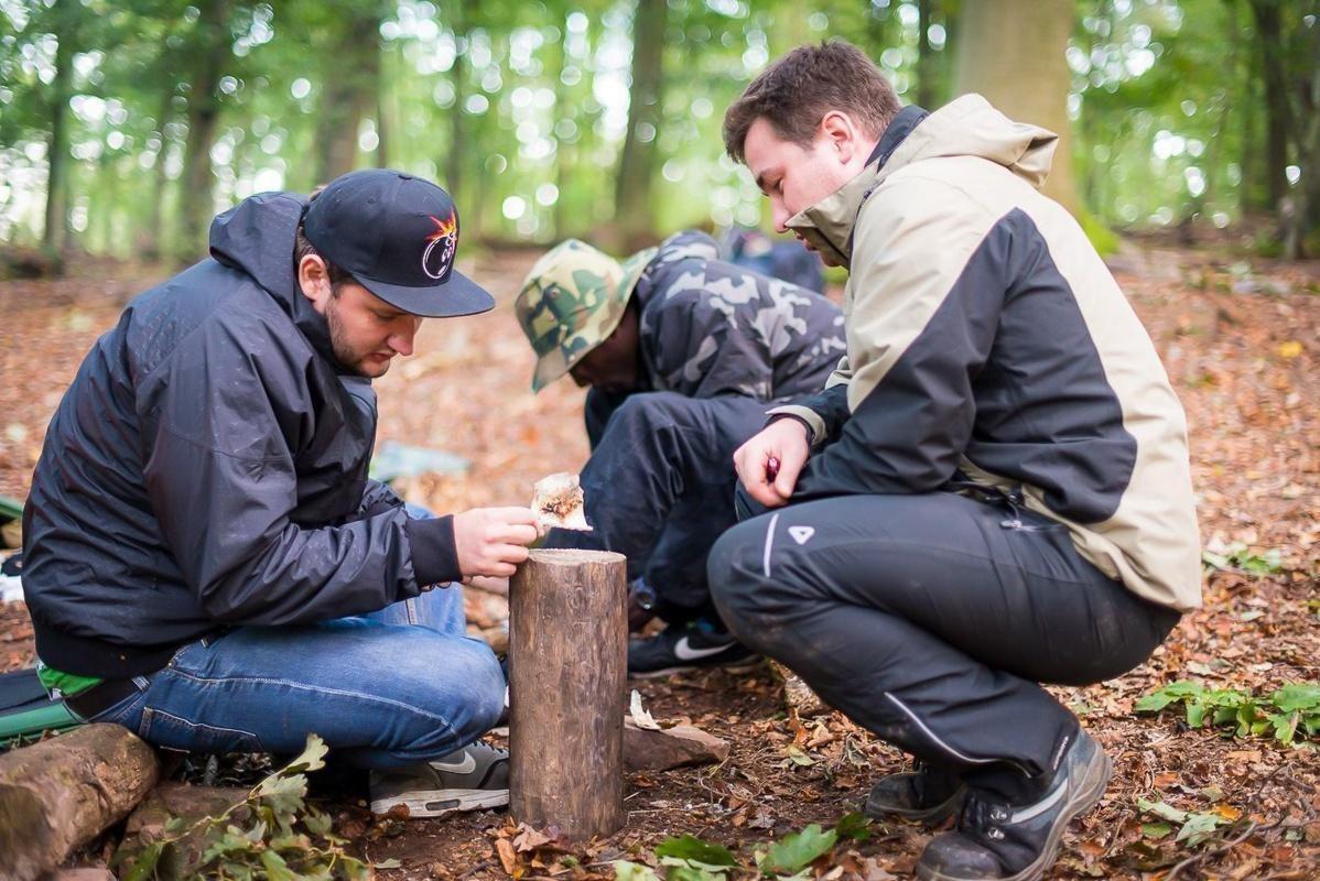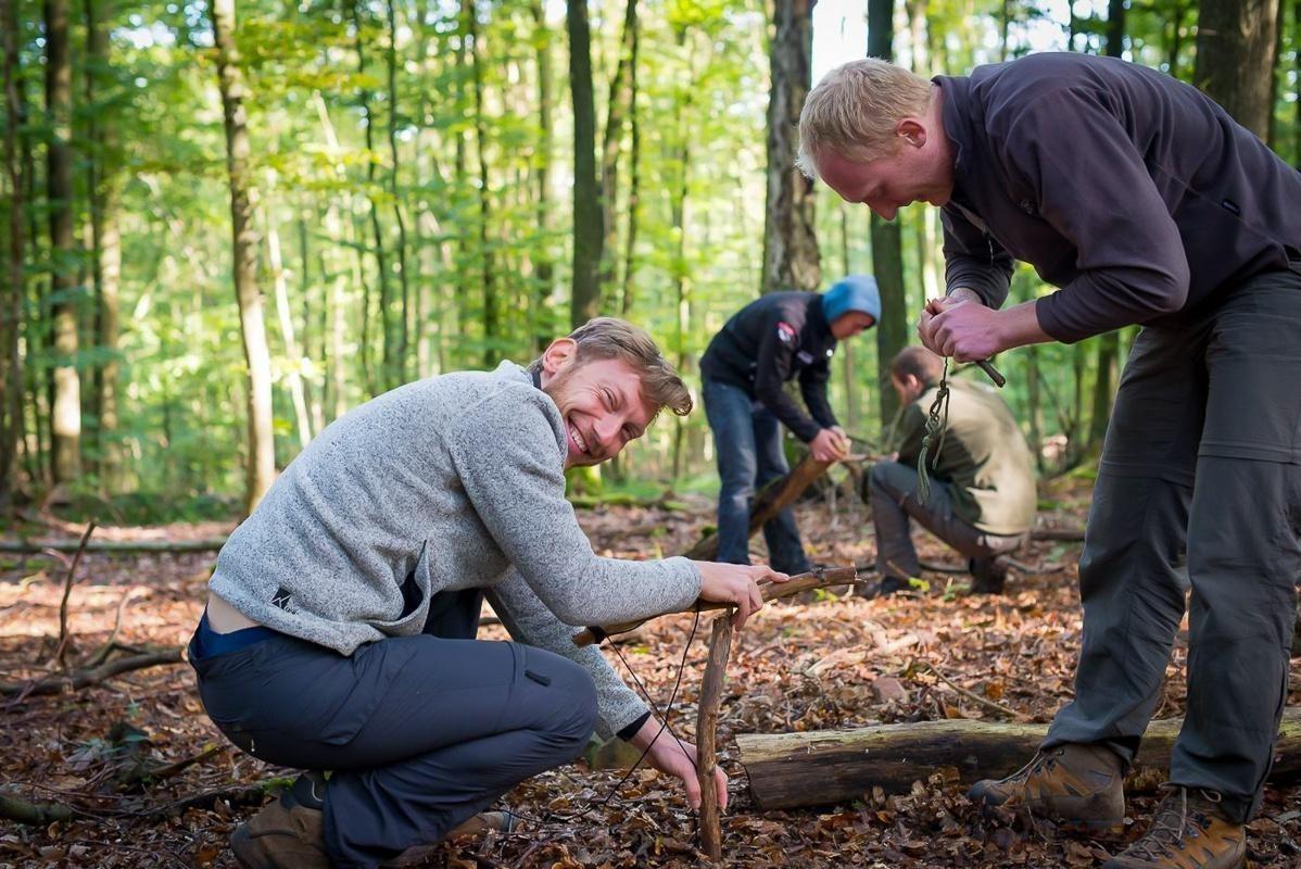 Gruppe arbeitet im Wald an verschiedenen Überlebenstechniken und Lagerfeuer