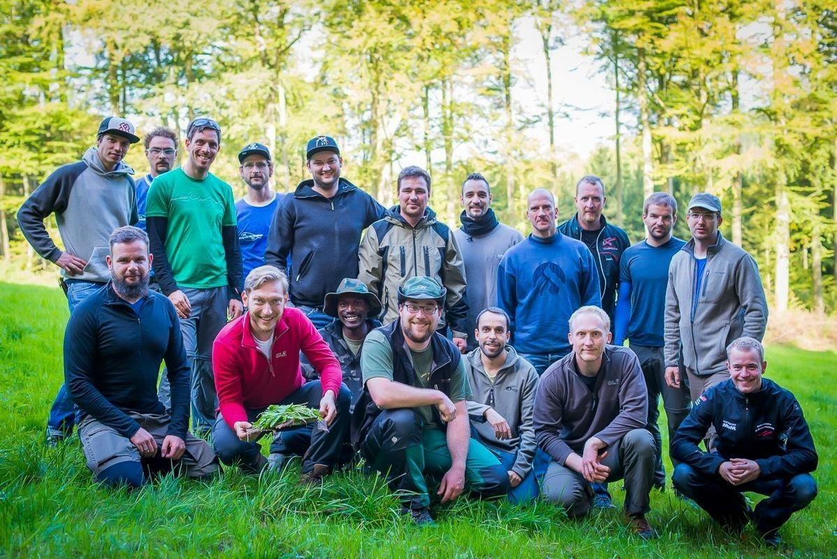 Gruppe arbeitet im Wald, umgeben von Pflanzen und Bäumen