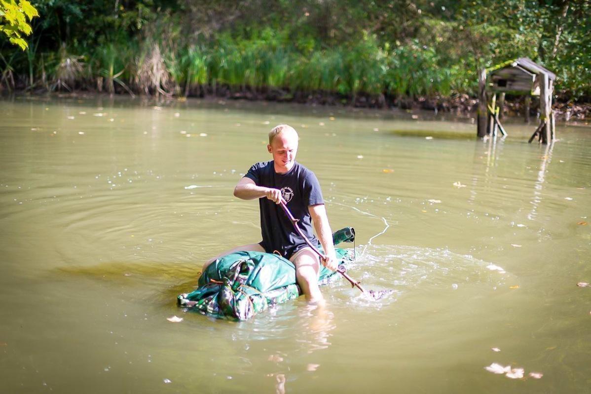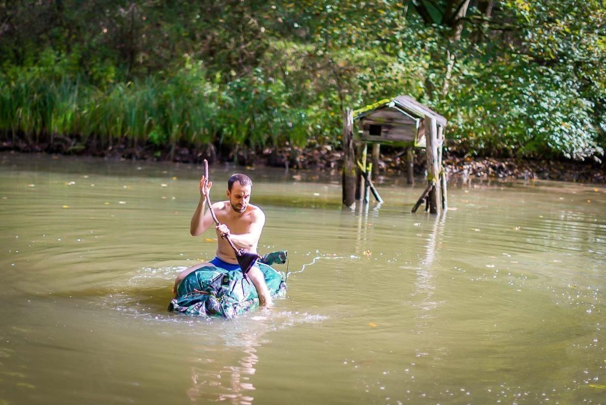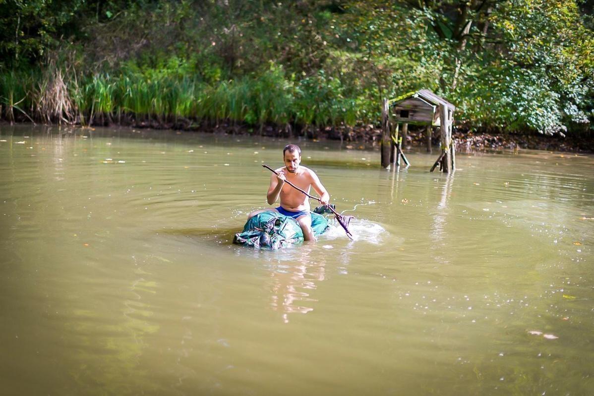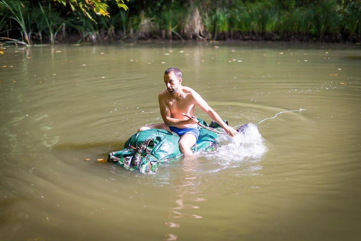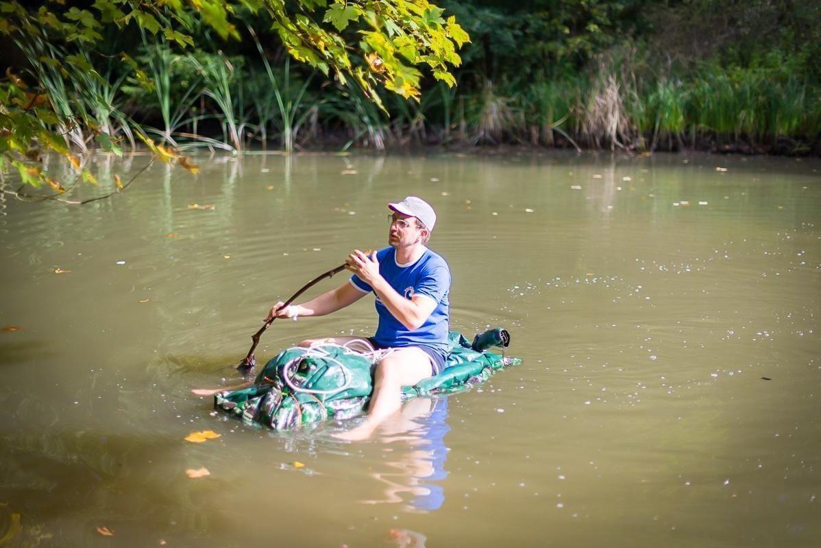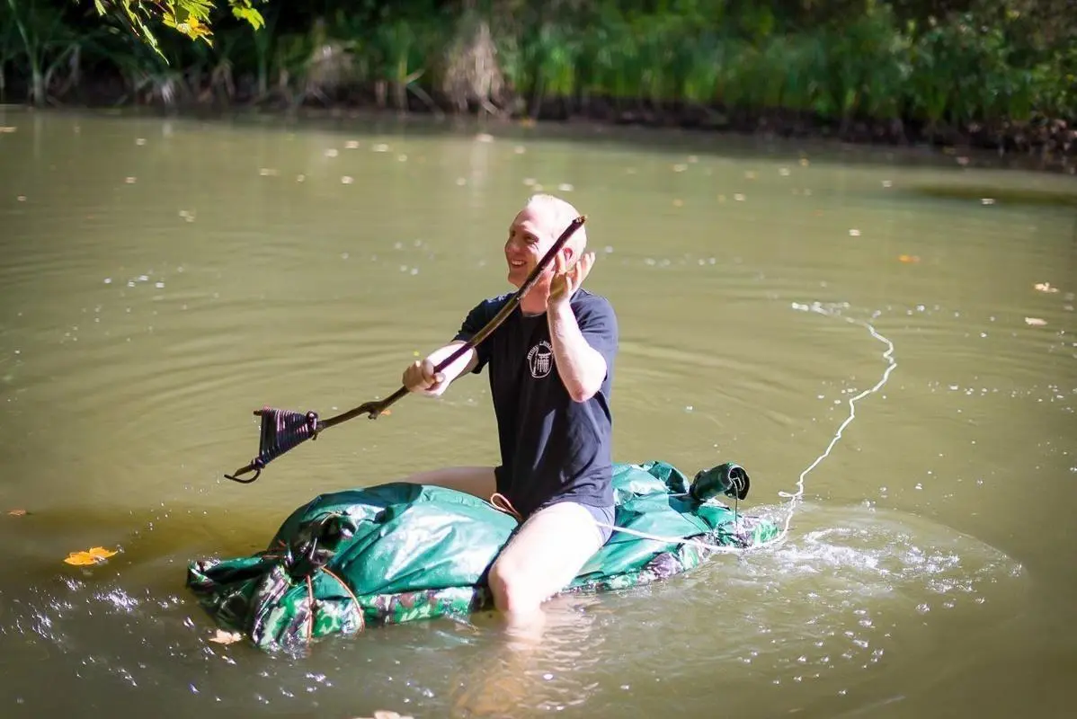 Mann paddelt auf einem improvisierten Floß durch einen ruhigen Gewässerabschnitt