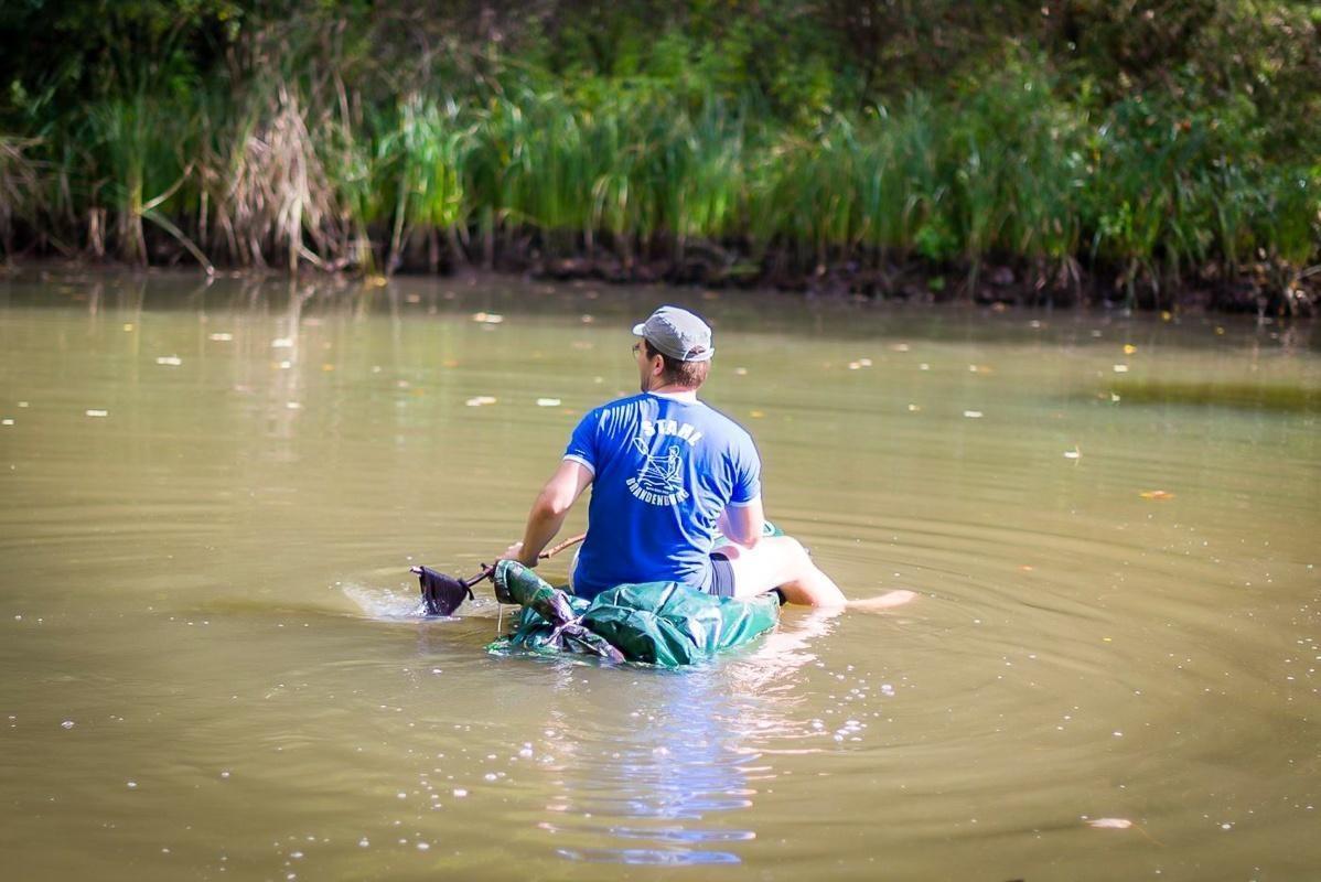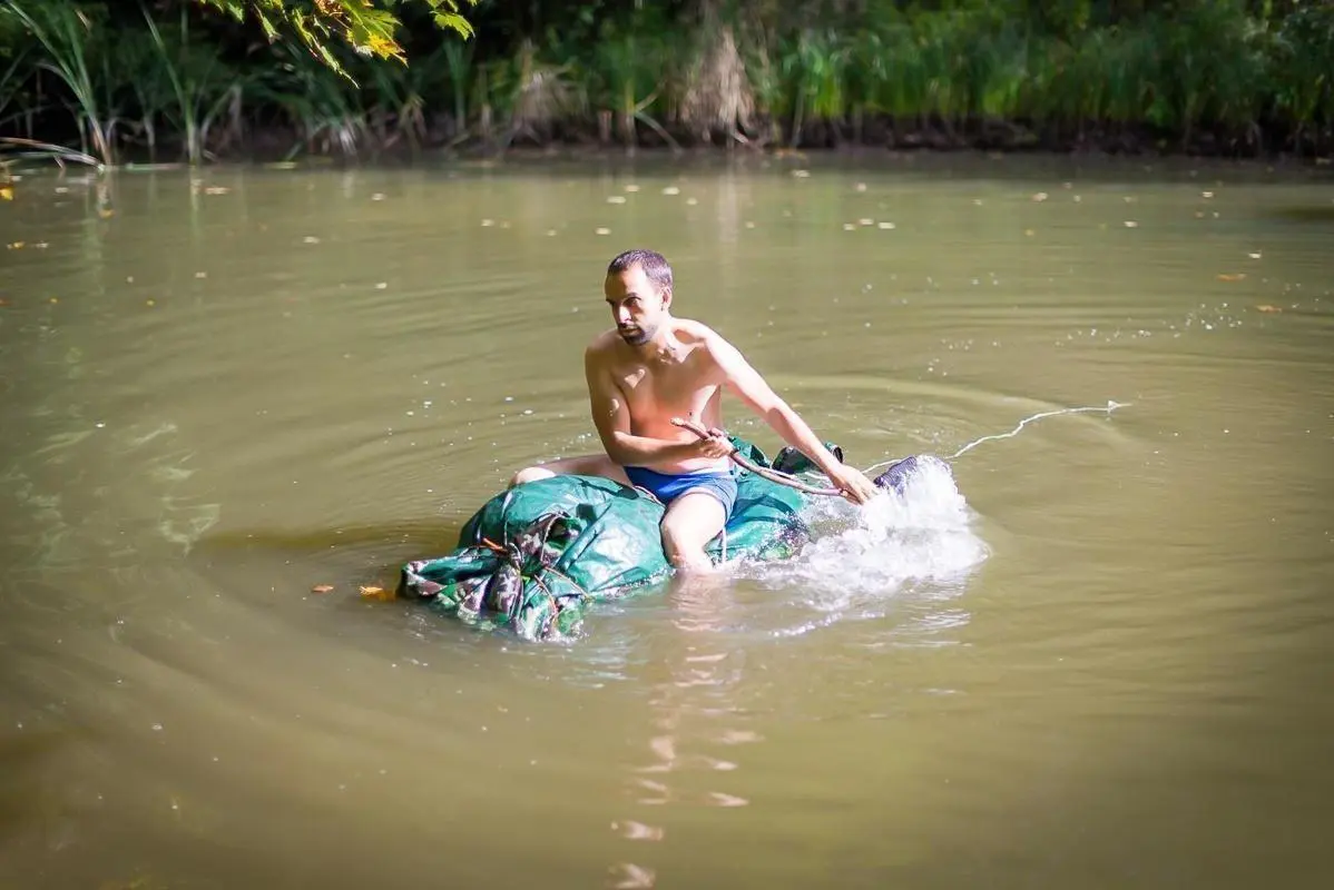 Mann paddelt auf improvisierter Schwimmhilfe durch einen ruhigen Gewässerbereich