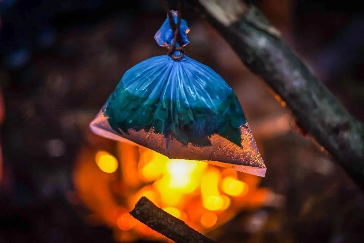Kunststoffbeutel hängt über einem kleinen Feuer zur Wassererwärmung