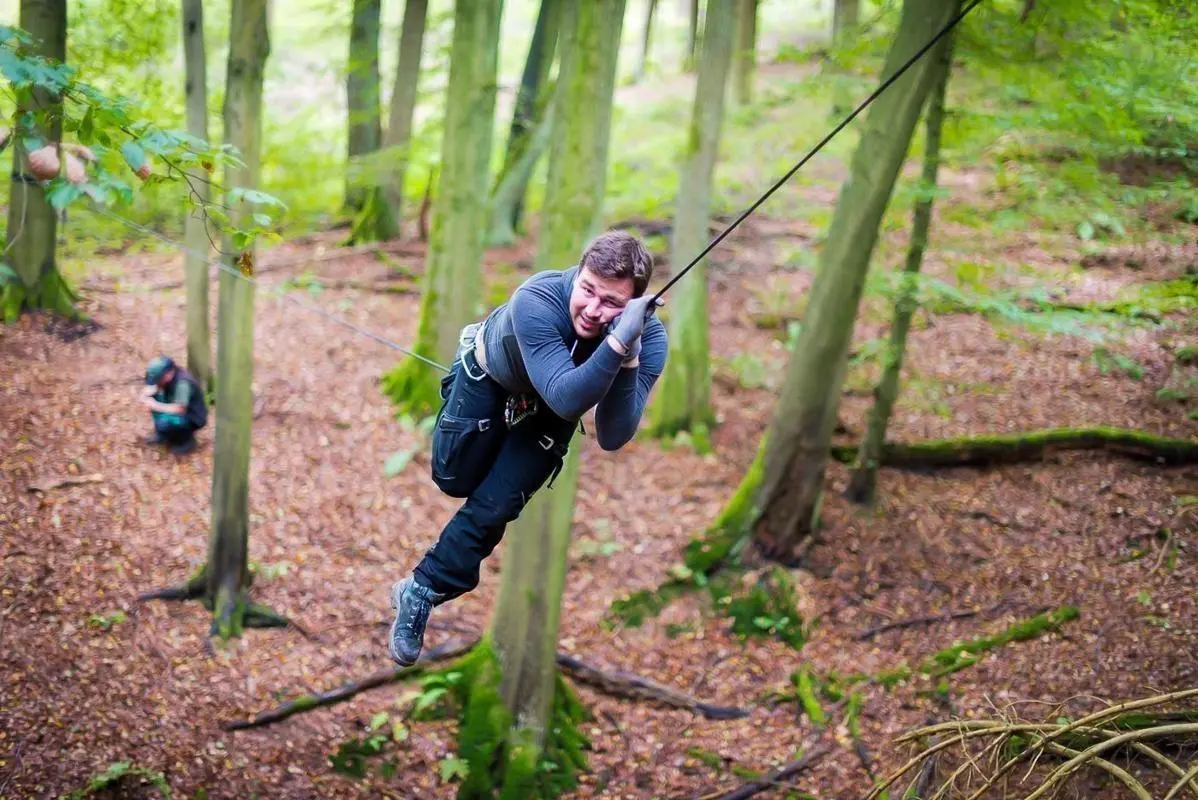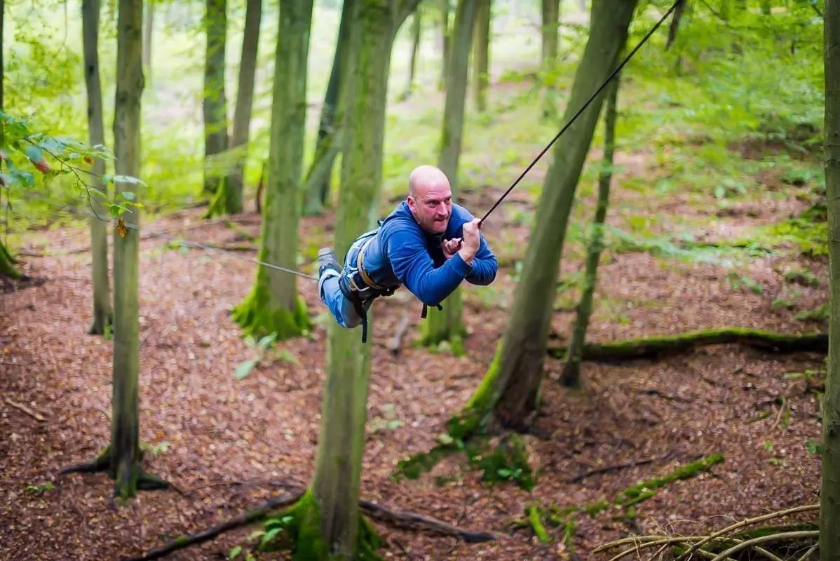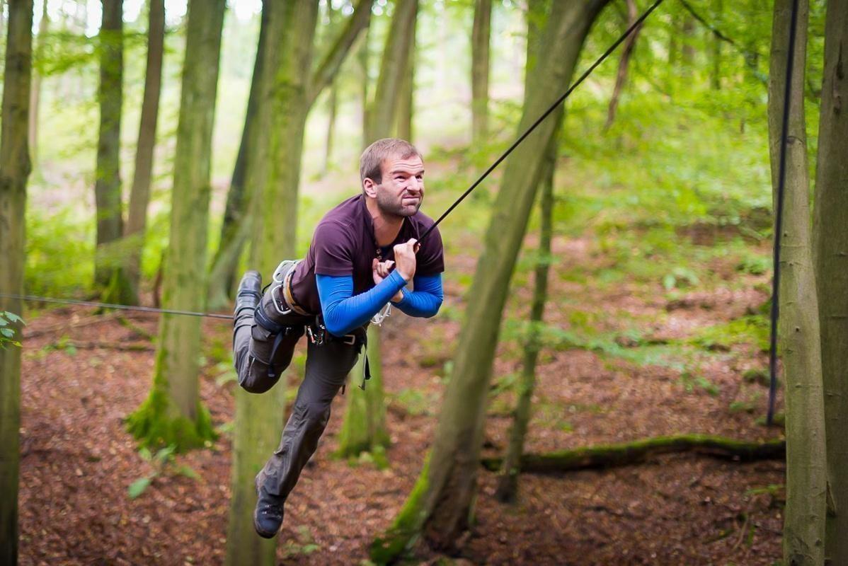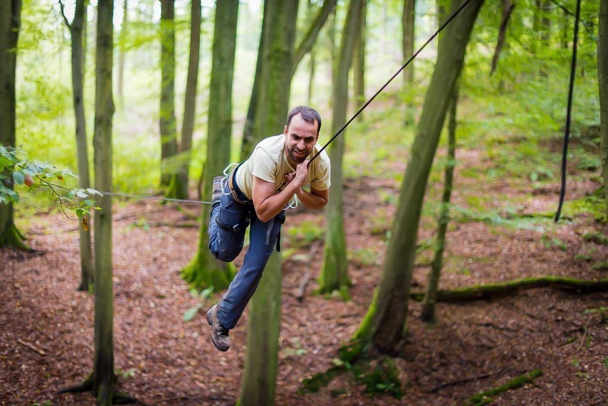 Seilquerung an einem gespannten Seil zwischen Bäumen im Wald