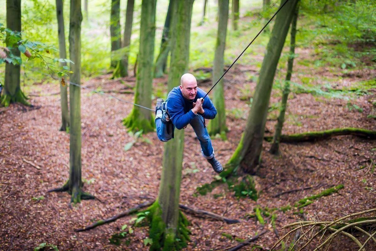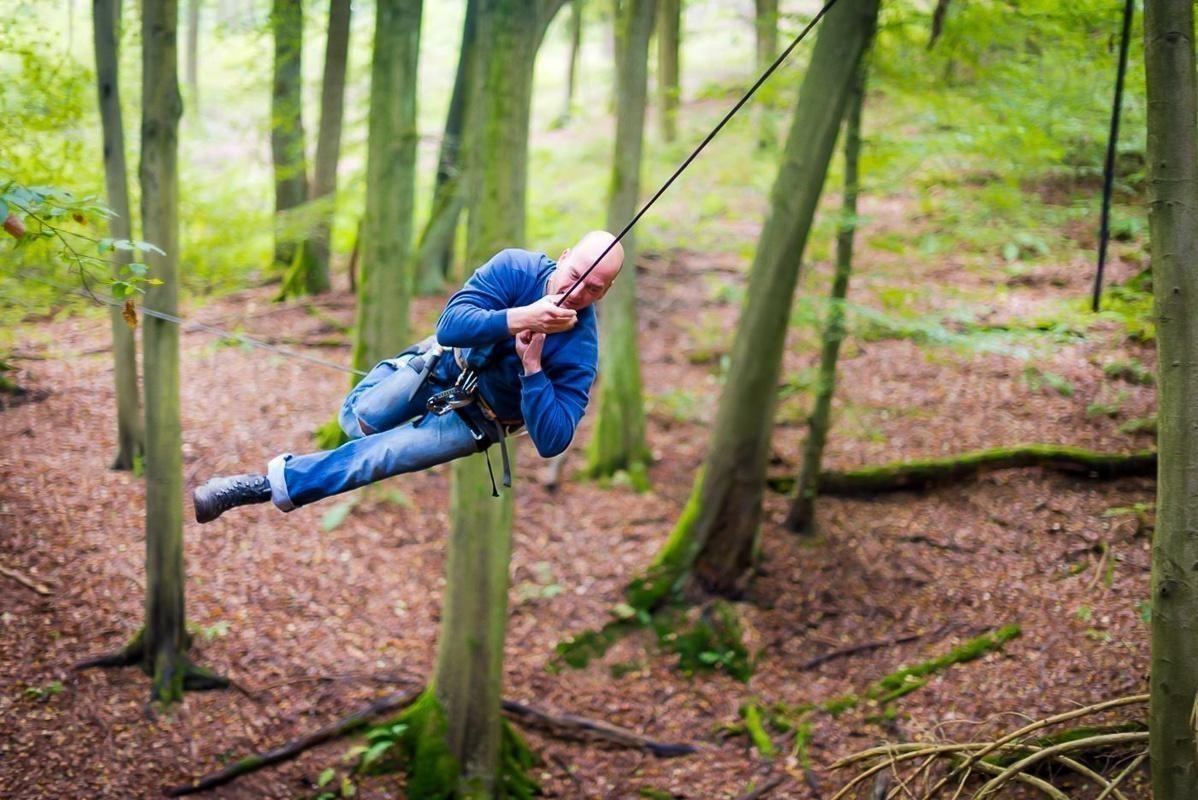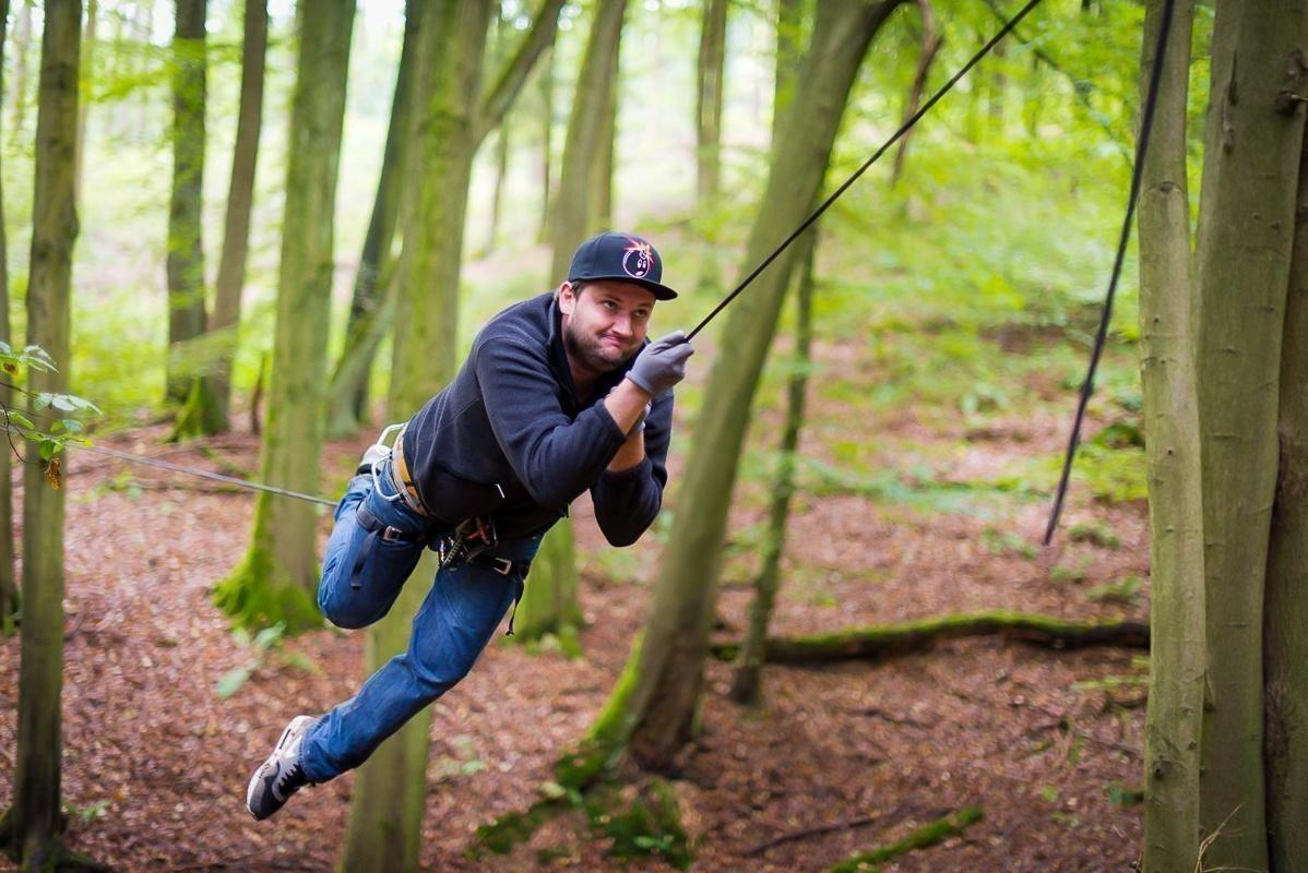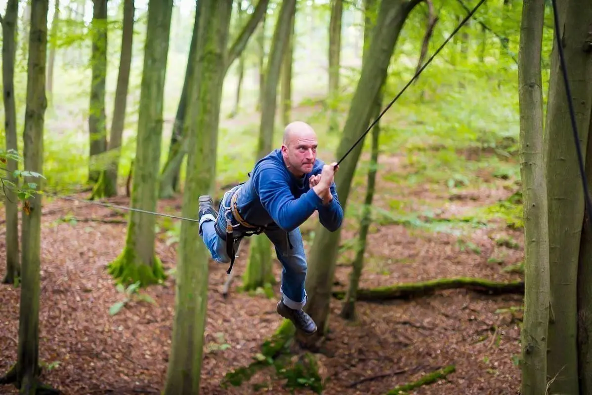 Seilquerung an einem gespannten Seil zwischen Bäumen im Wald