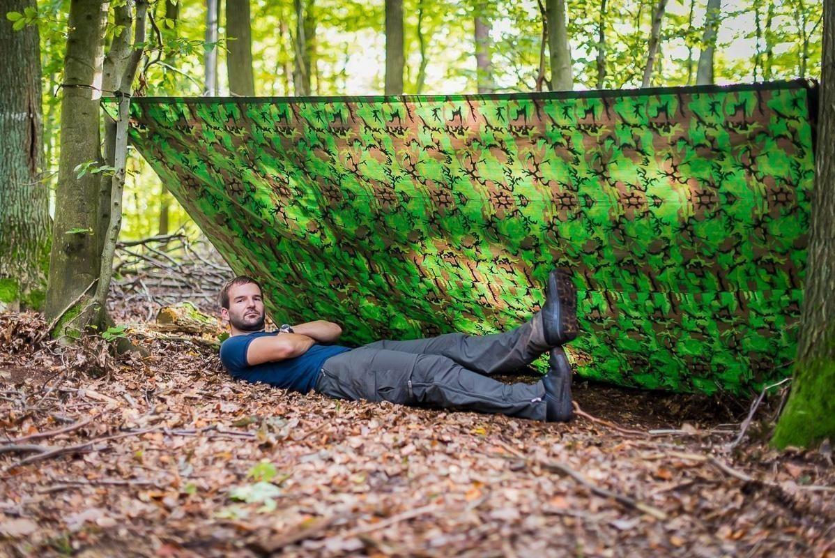 Mann liegt unter einer Tarp-Notunterkunft im Wald auf dem Boden