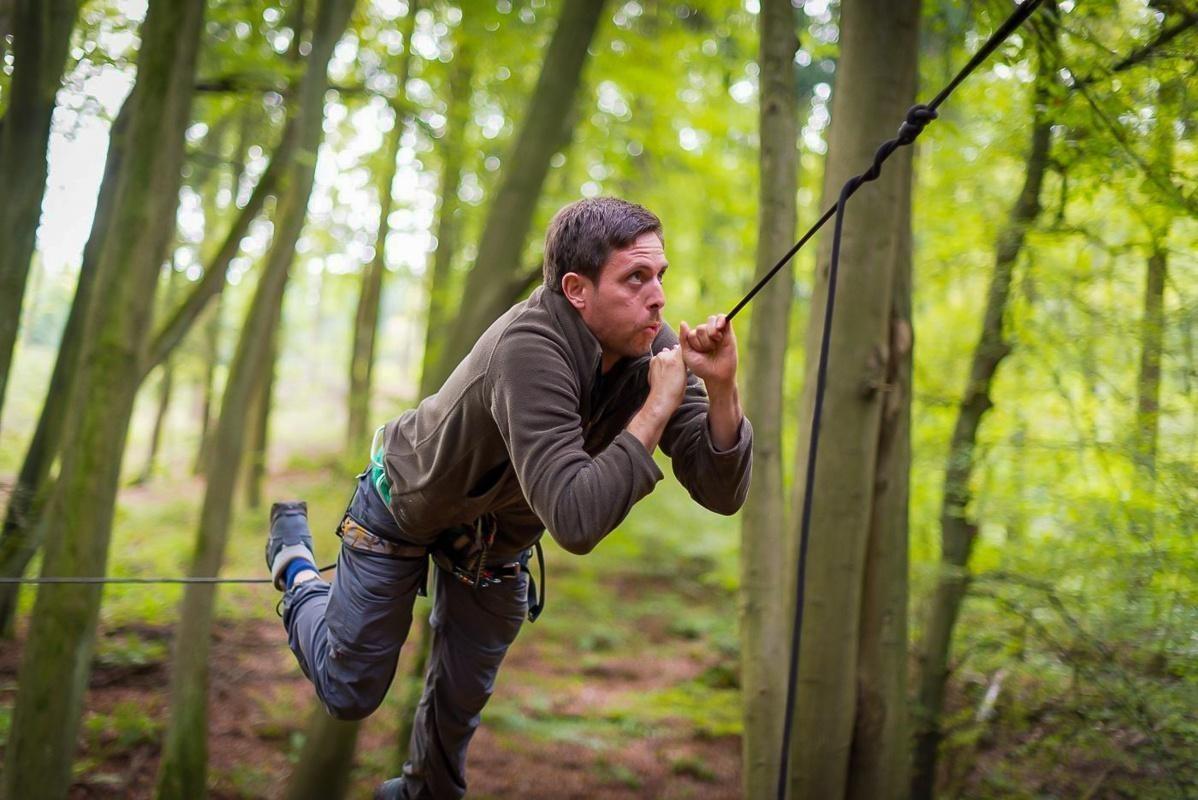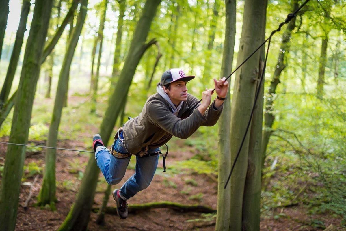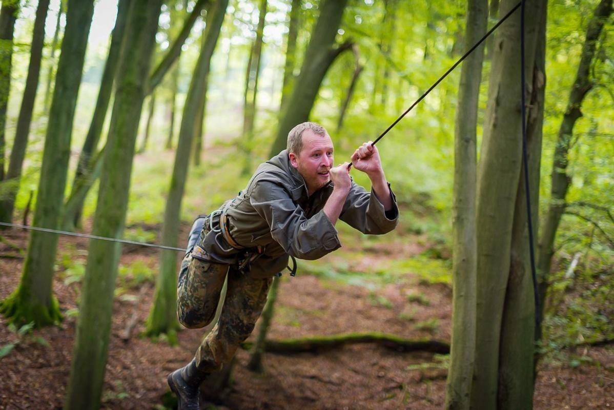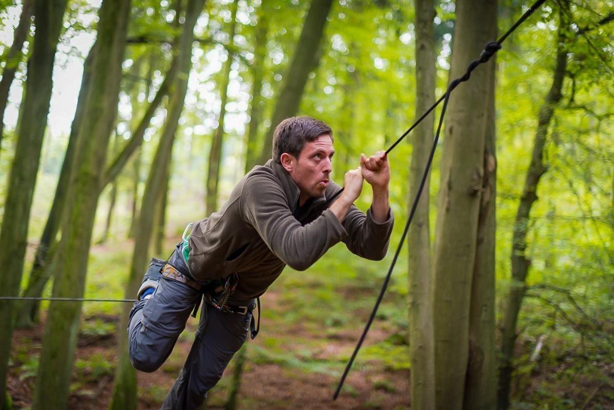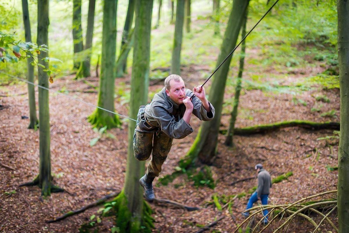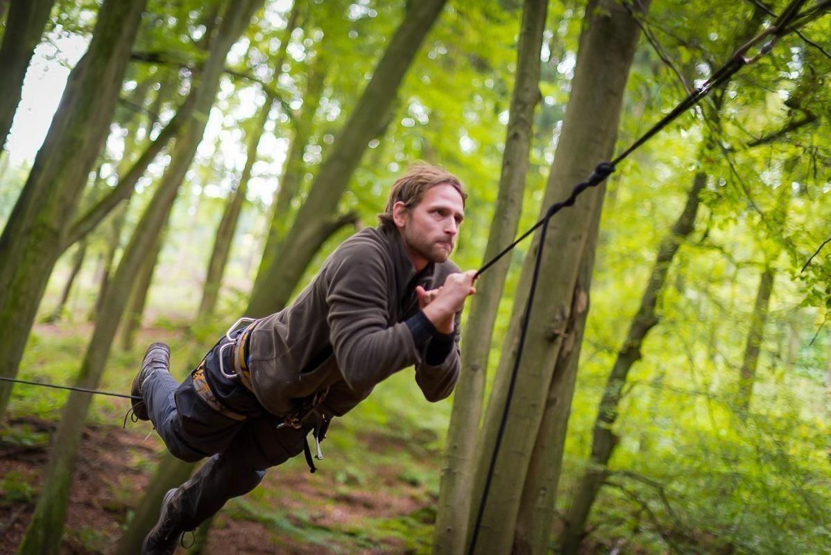 Teilnehmer überquert eine selbstgebaute Seilbrücke zwischen zwei Bäumen