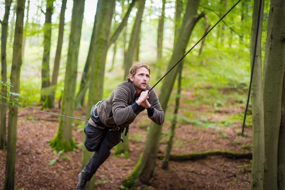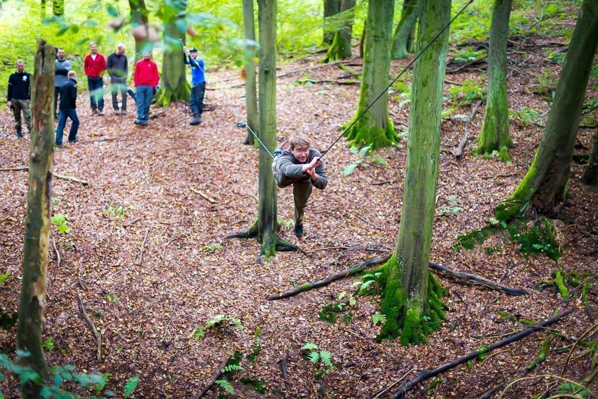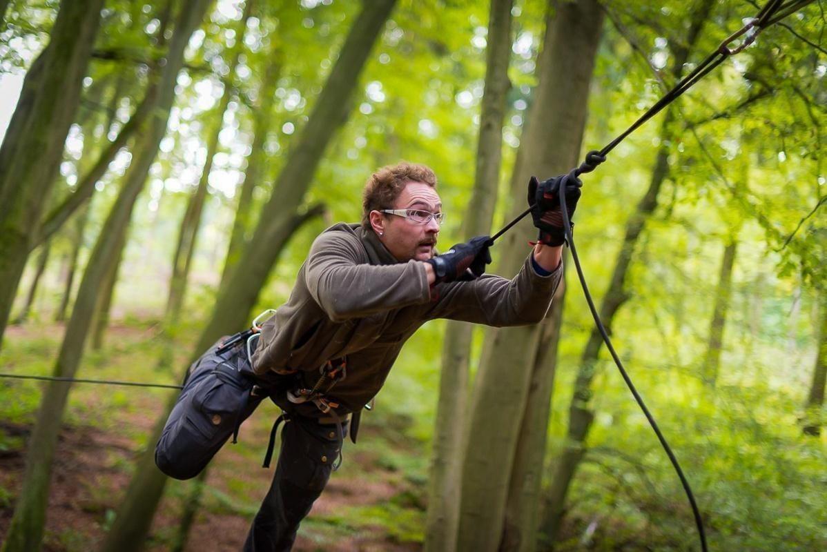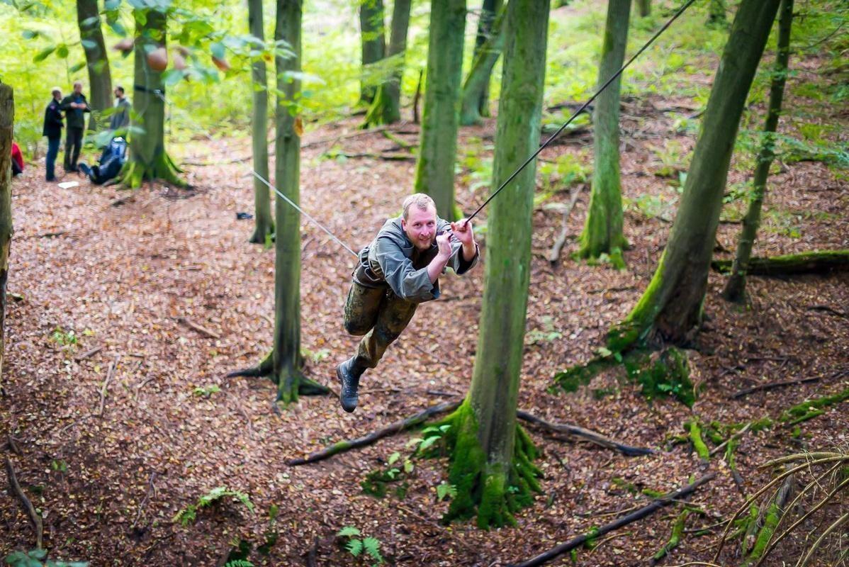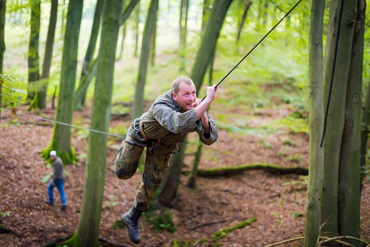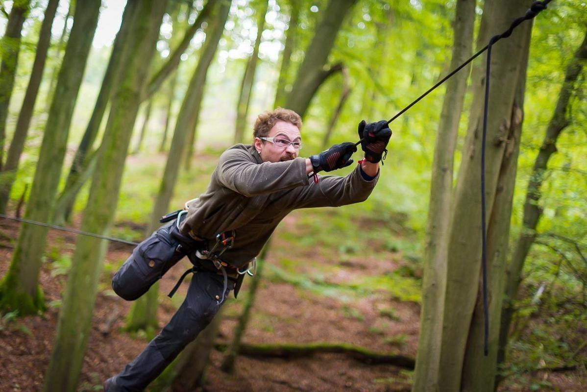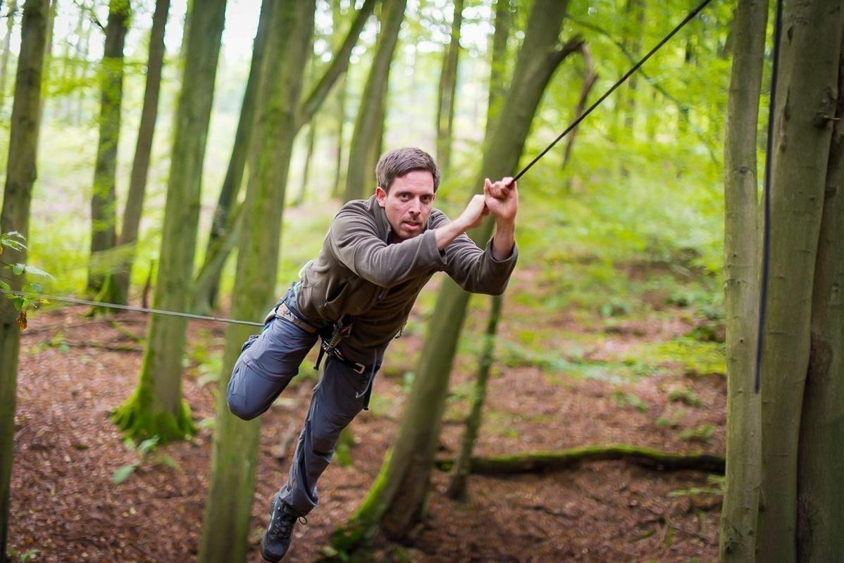 Teilnehmer überquert eine selbstgebaute Seilbrücke zwischen zwei Bäumen