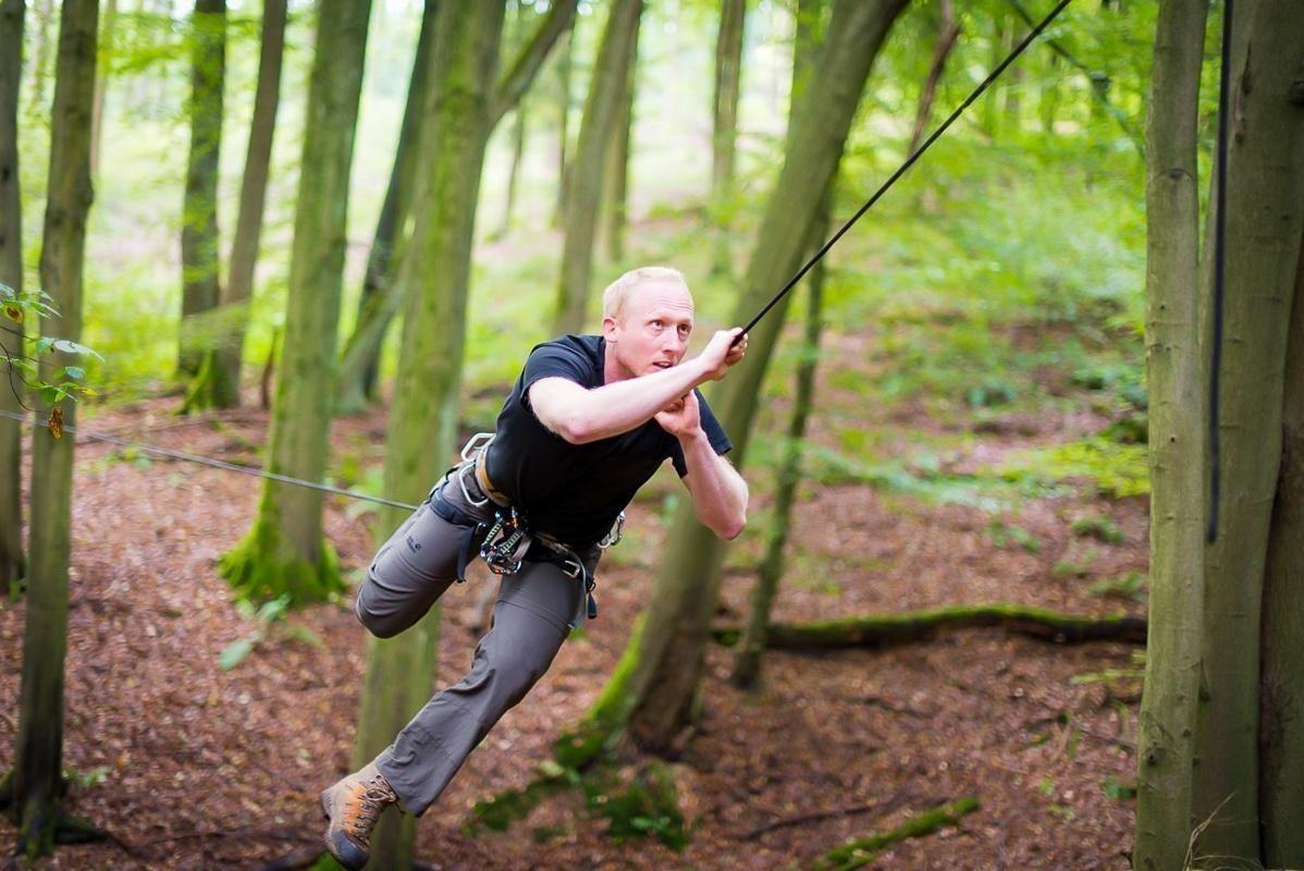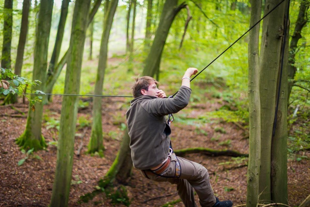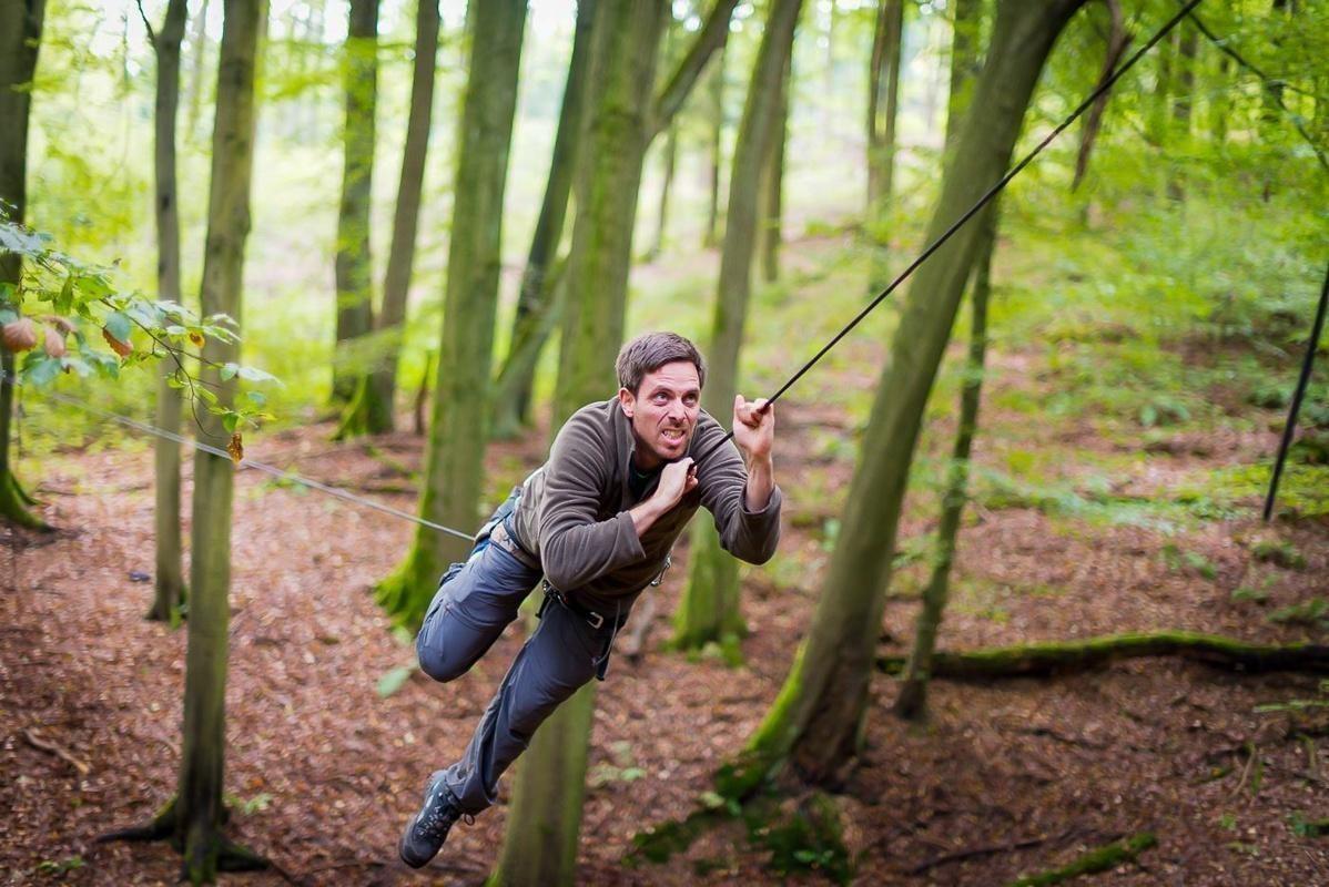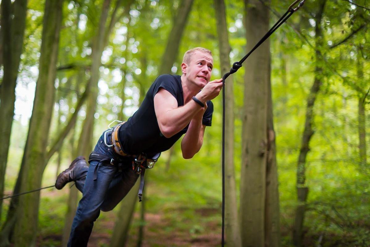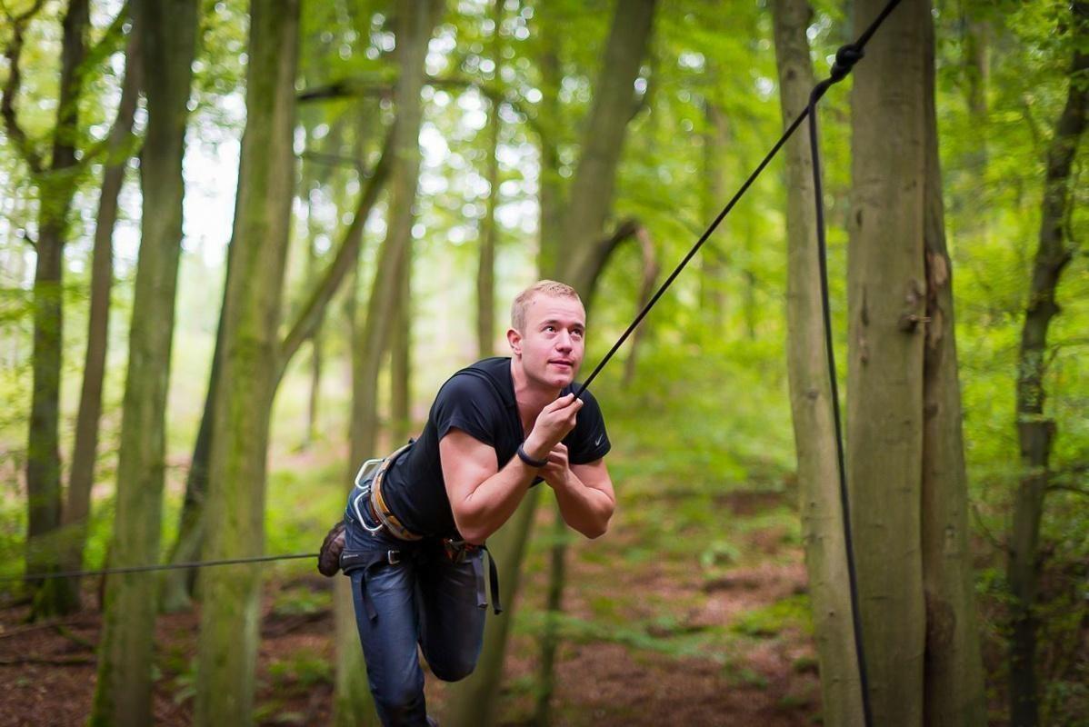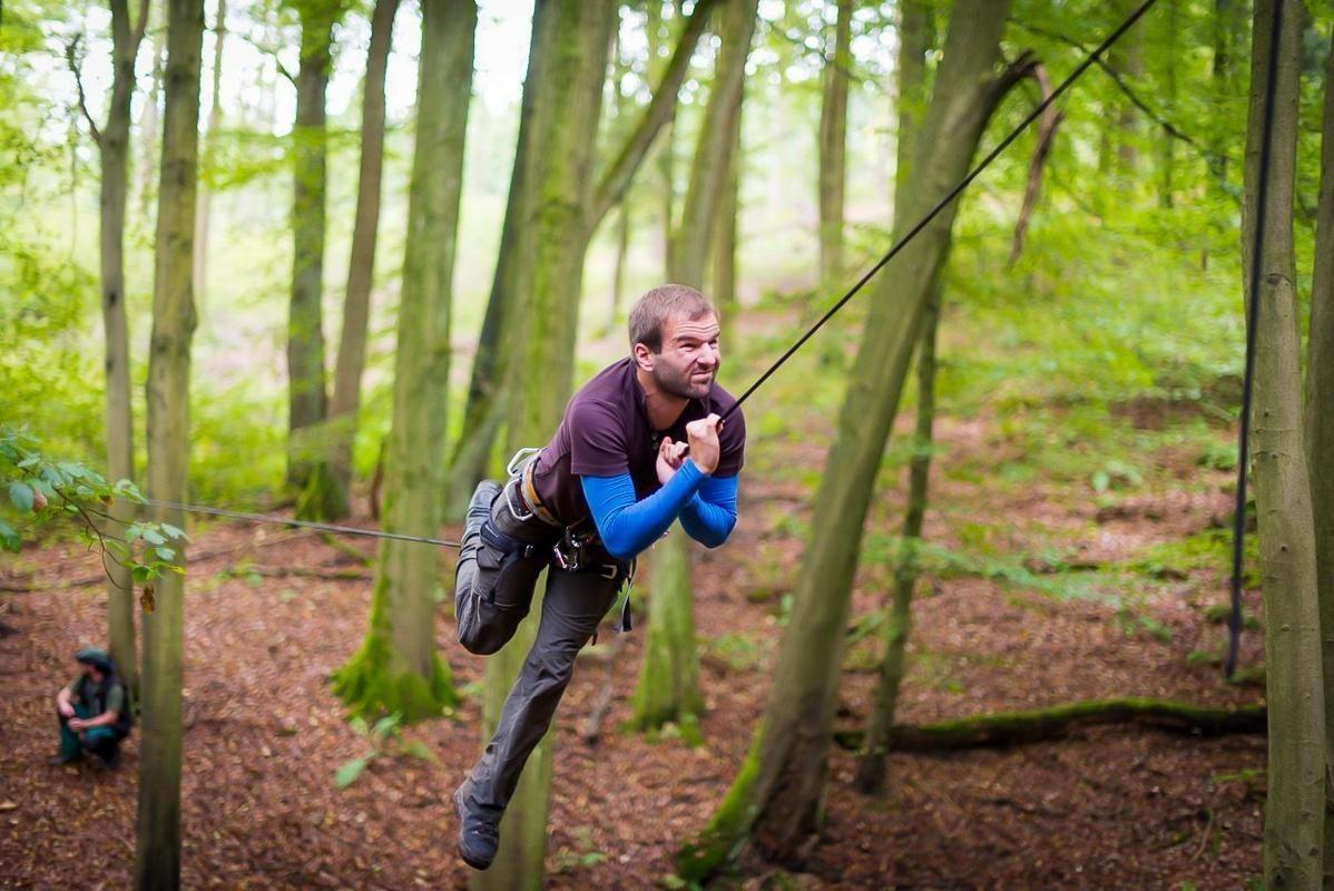 Teilnehmer überquert eine selbstgebaute Seilbrücke zwischen zwei Bäumen