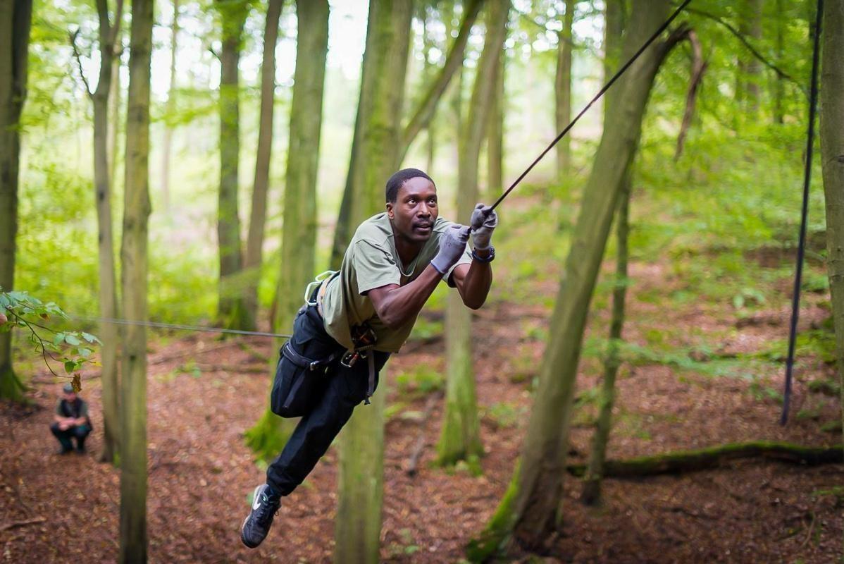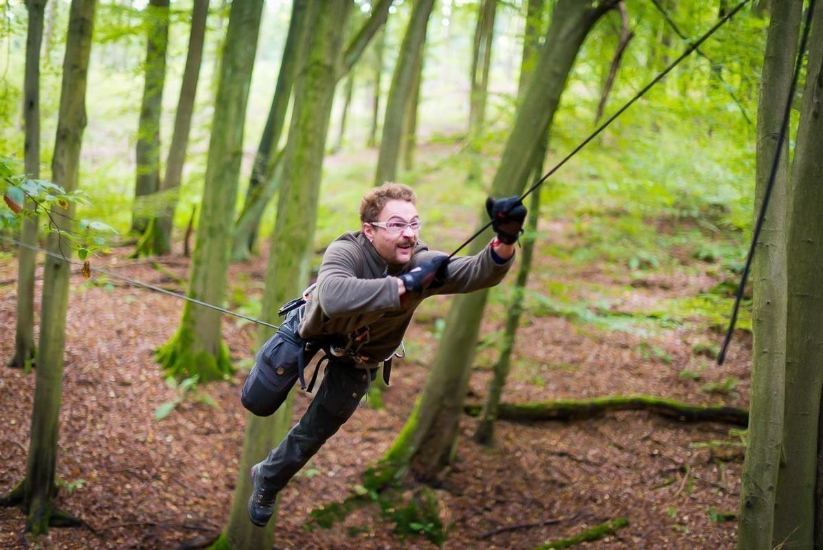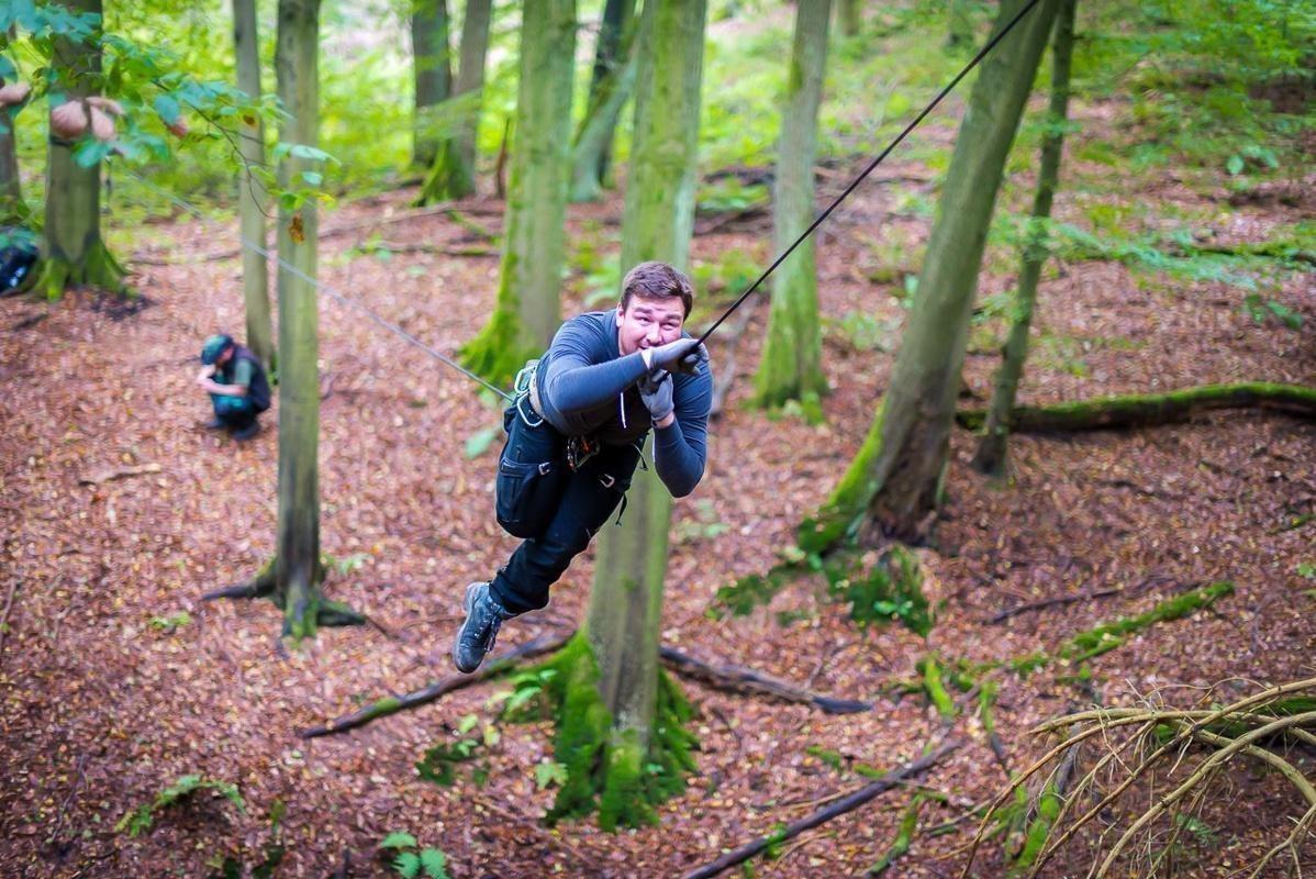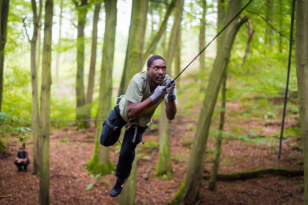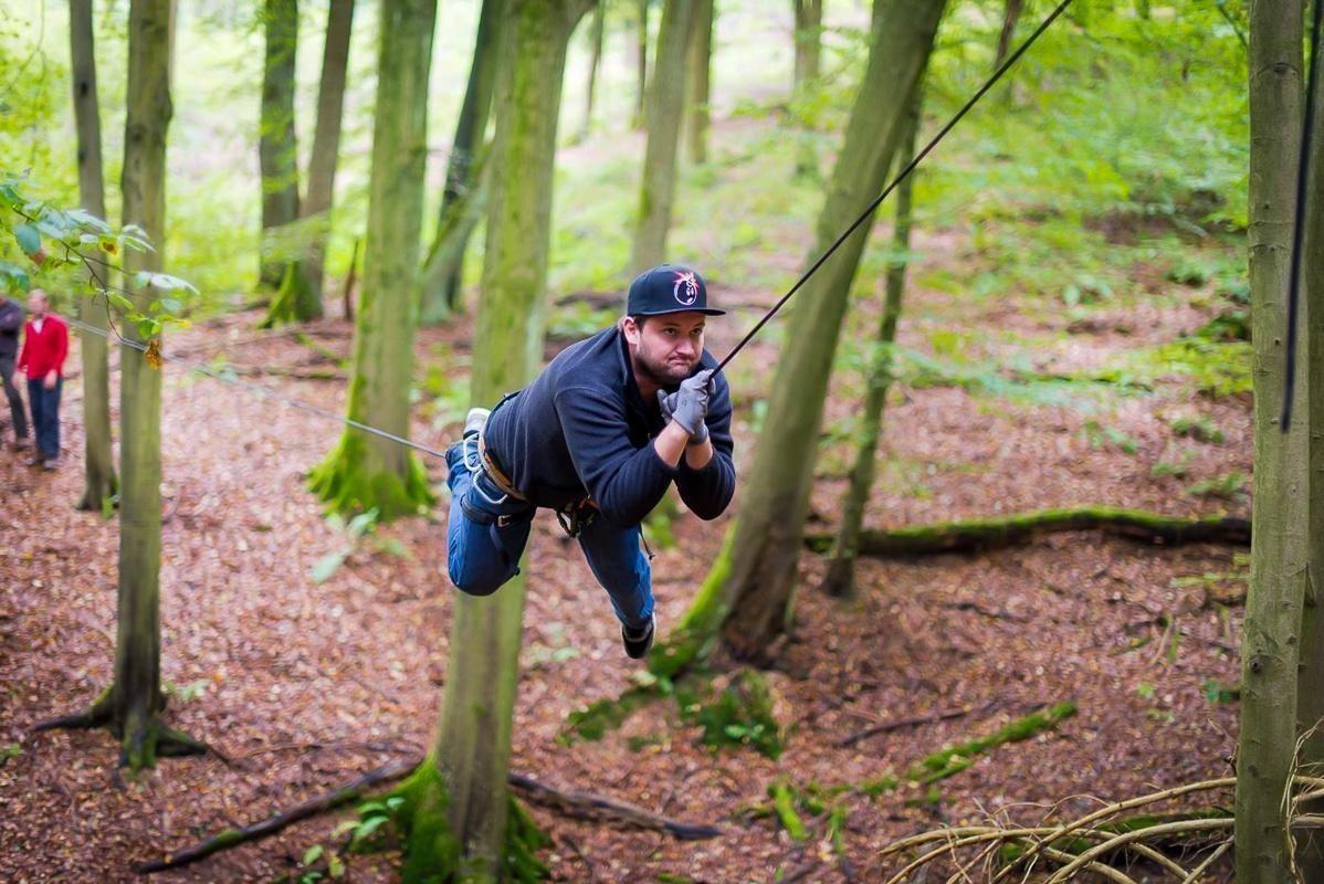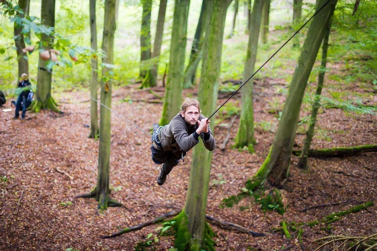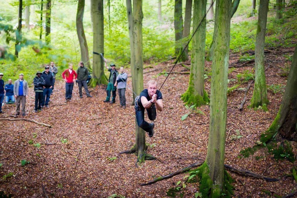 Teilnehmer überquert eine selbstgebaute Seilbrücke zwischen zwei Bäumen