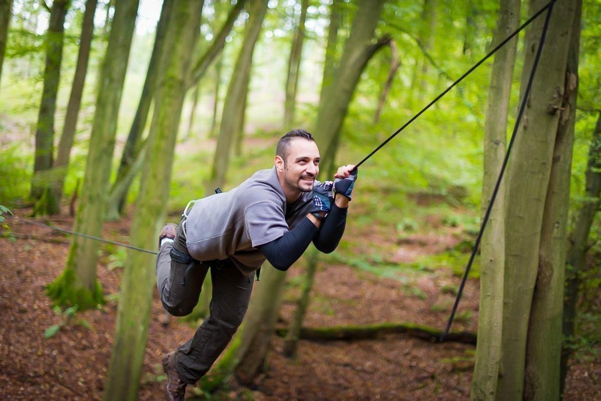 Mann überquert eine selbstgebaute Seilbrücke zwischen Bäumen