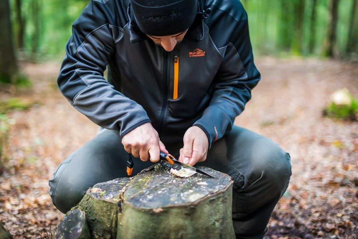 Messer bearbeitet Holzstück im Wald, während eine Person sitzt und zuschaut