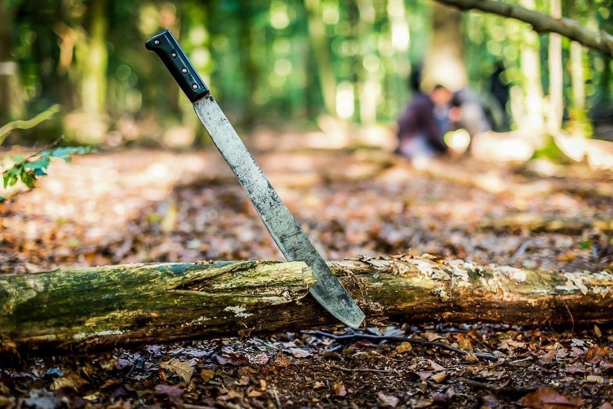 Messer steckt in einem umgefallenen Baumstamm im Wald