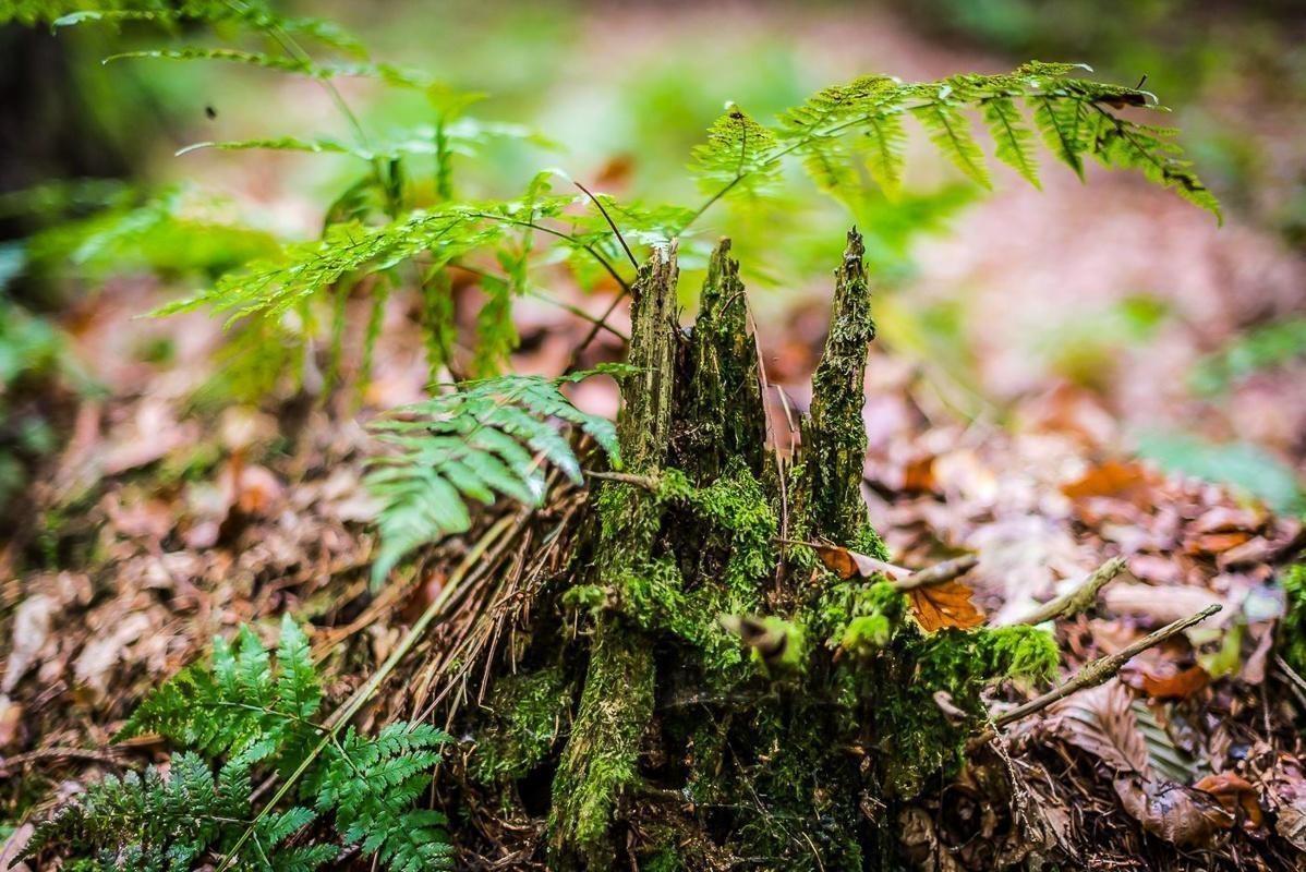 Moosbedeckter Baumstumpf mit jungen Farnen im Wald