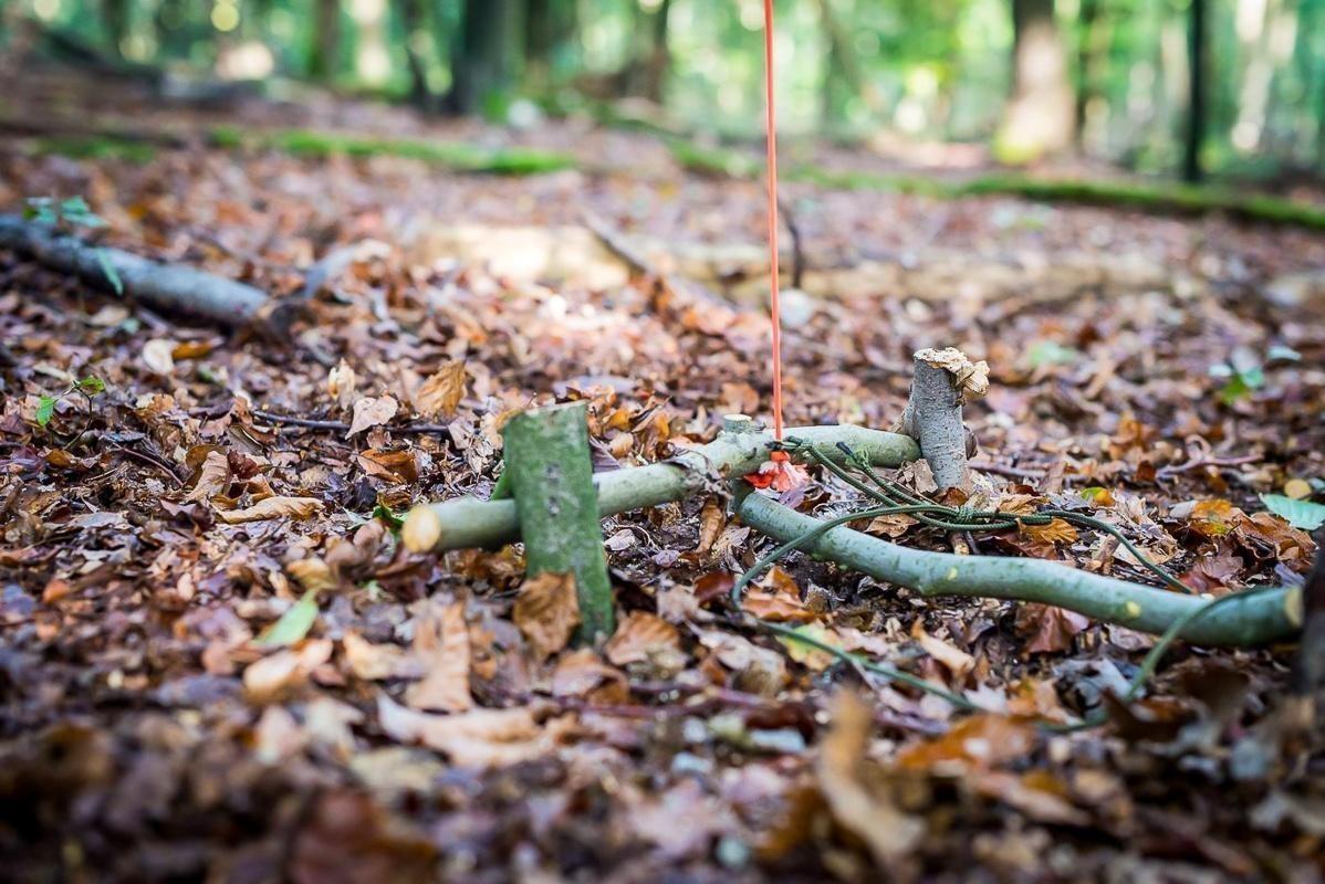 Zwei Personen arbeiten im Wald an einer selbstgebauten Schlagfalle (Figure-Four-Falle)