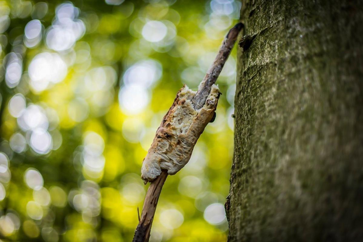 Zunderstück an einem Baumstamm befestigt, um Feuer zu entfachen