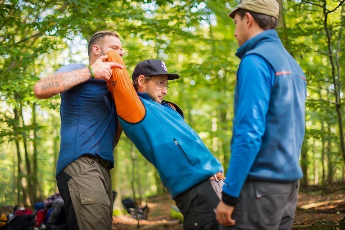 Zwei Personen üben eine Technik im Wald, während Rucksäcke im Hintergrund stehen