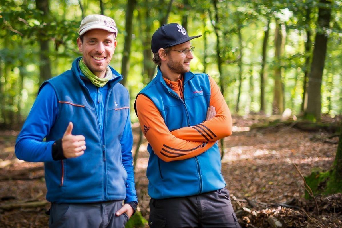 Zwei Personen in blauer und orangefarbener Jacke stehen im Wald