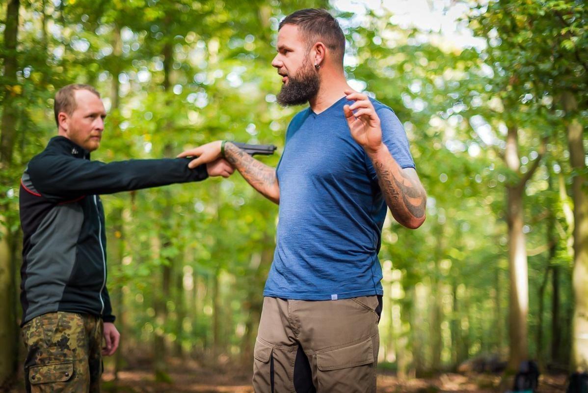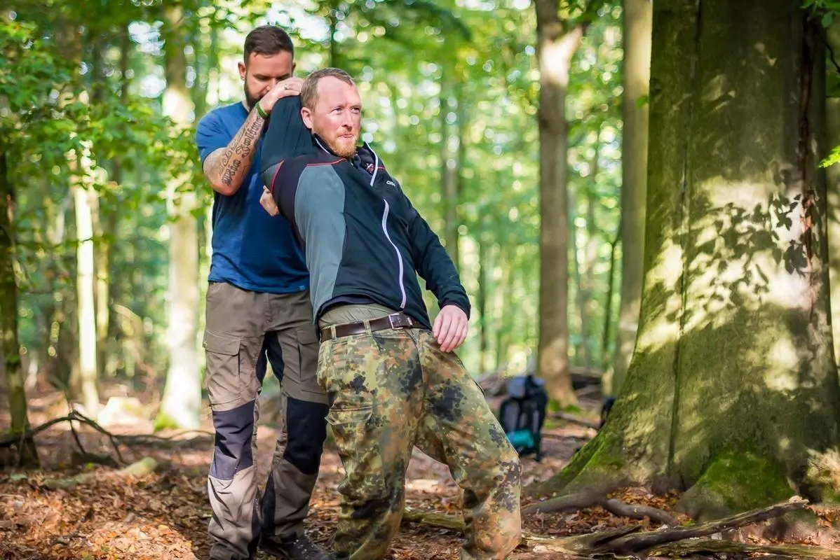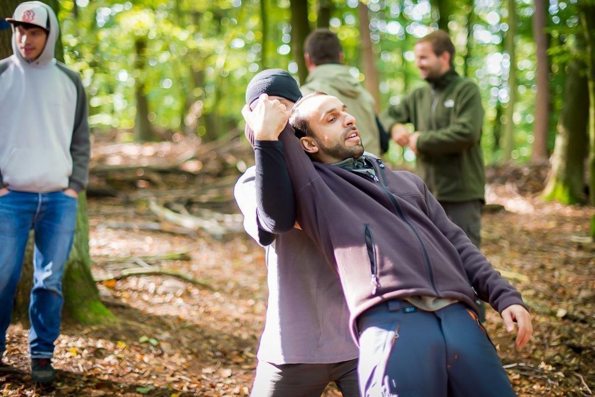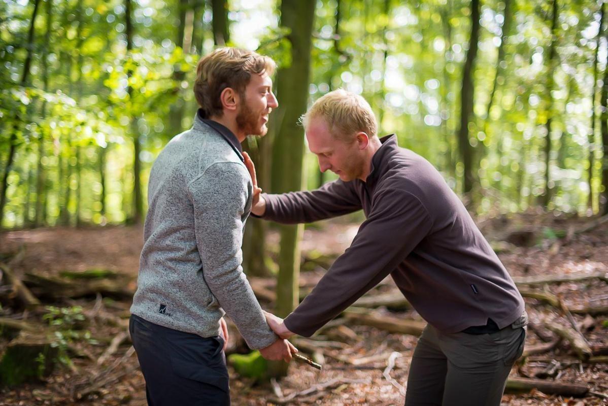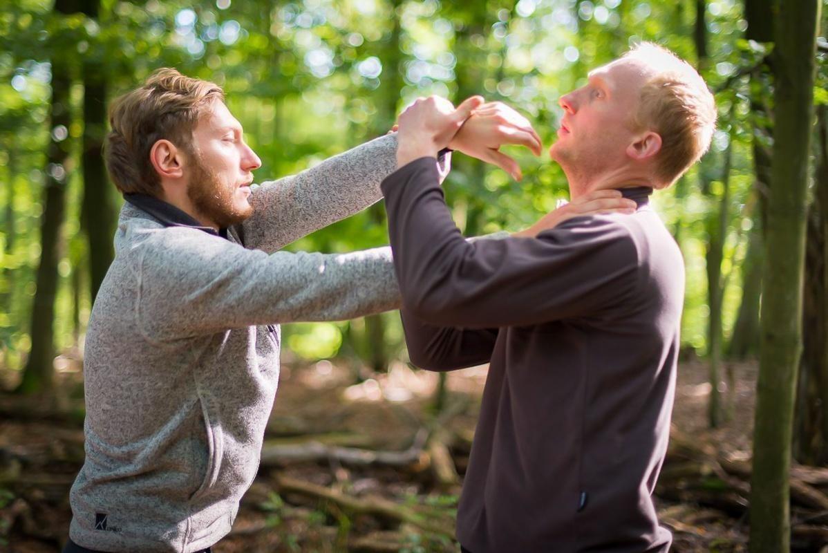 Zwei Personen üben eine Technik zur Selbstverteidigung im Wald