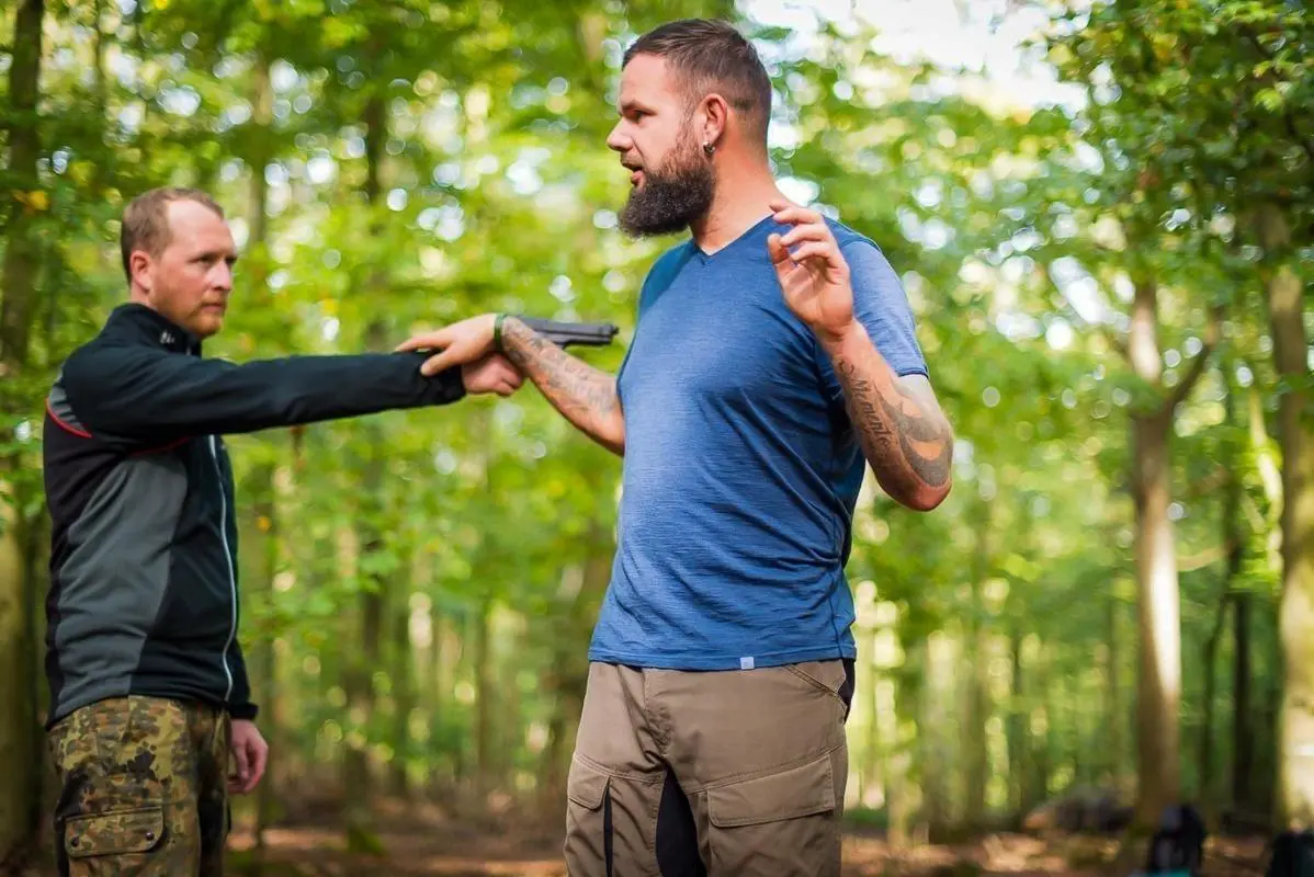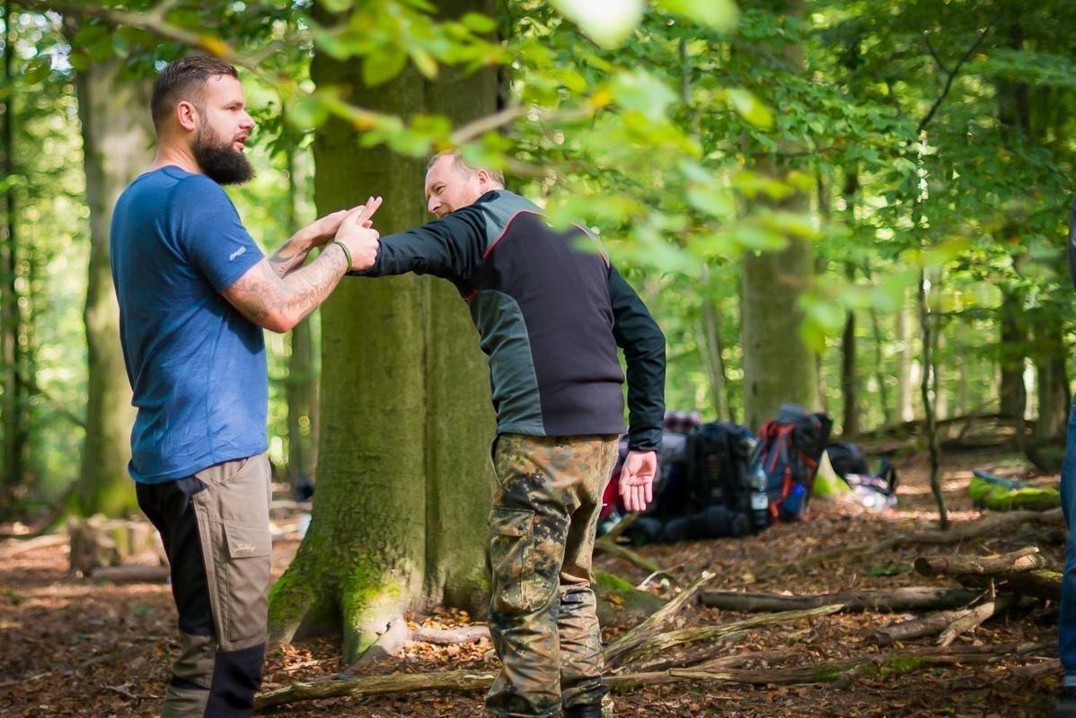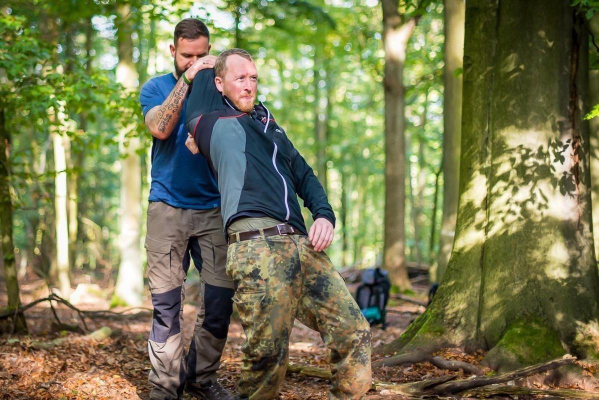 Zwei Personen üben eine Technik zur Selbstverteidigung im Wald aus
