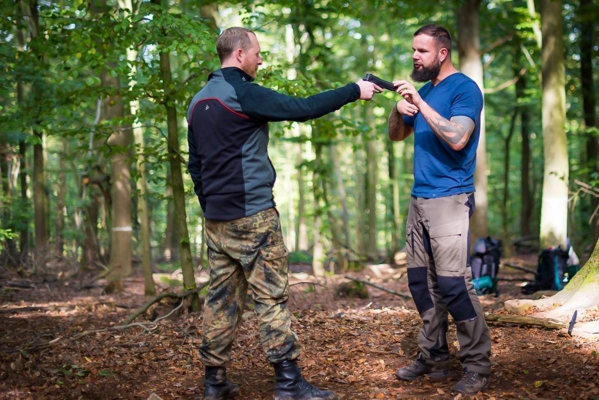 Zwei Personen in Waldumgebung führen eine Interaktion mit einer Waffe durch