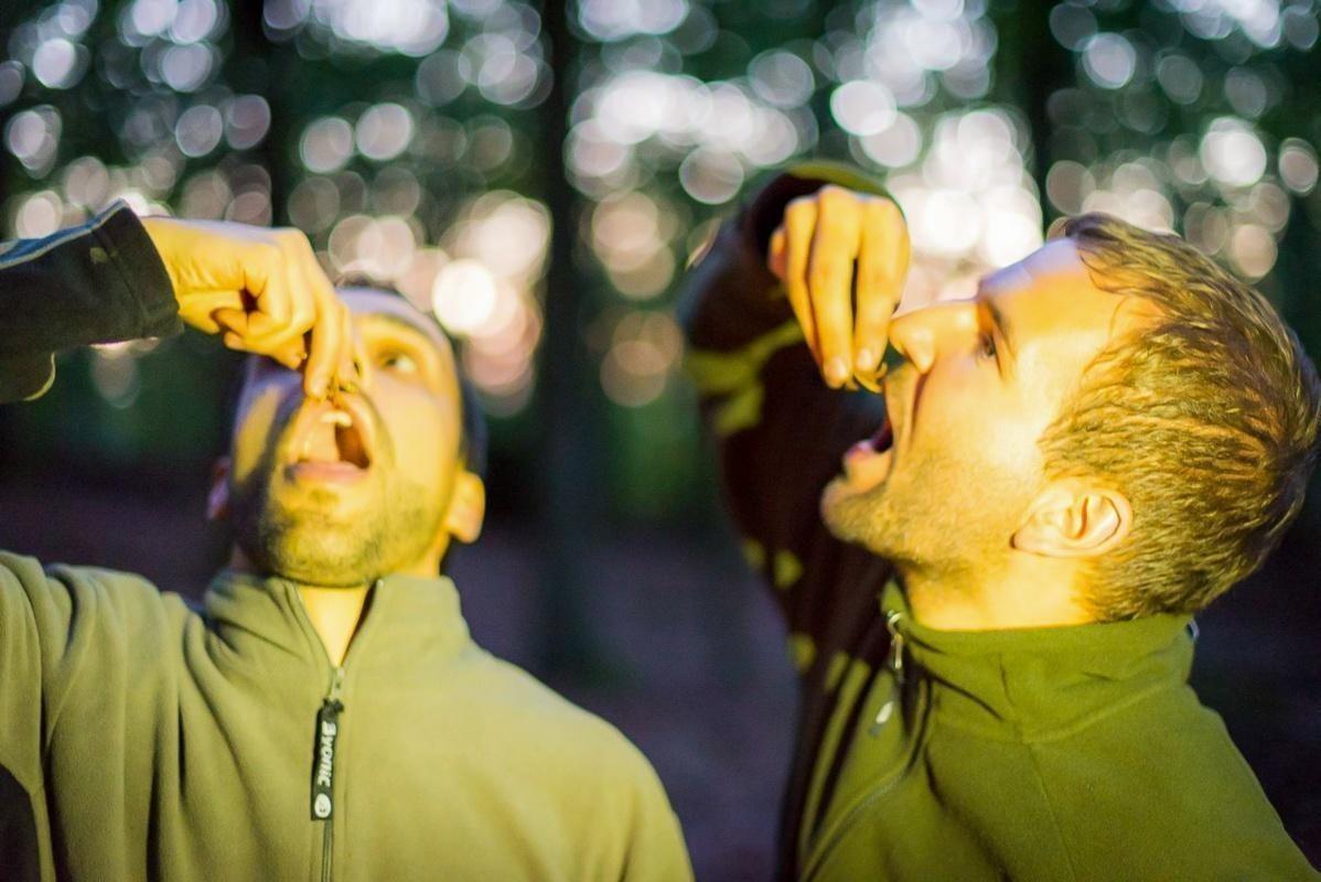 Zwei Personen demonstrieren eine Technik im Wald, eine Person hält die andere am Arm