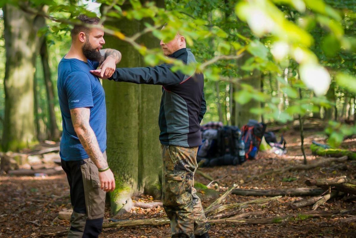Zwei Personen üben eine Technik zur Kontrolle in einem Waldgebiet