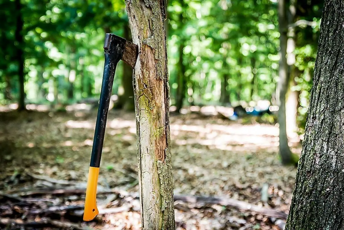 Messer schneidet in einen Holzstamm, während eine Hand das Holz stabilisiert