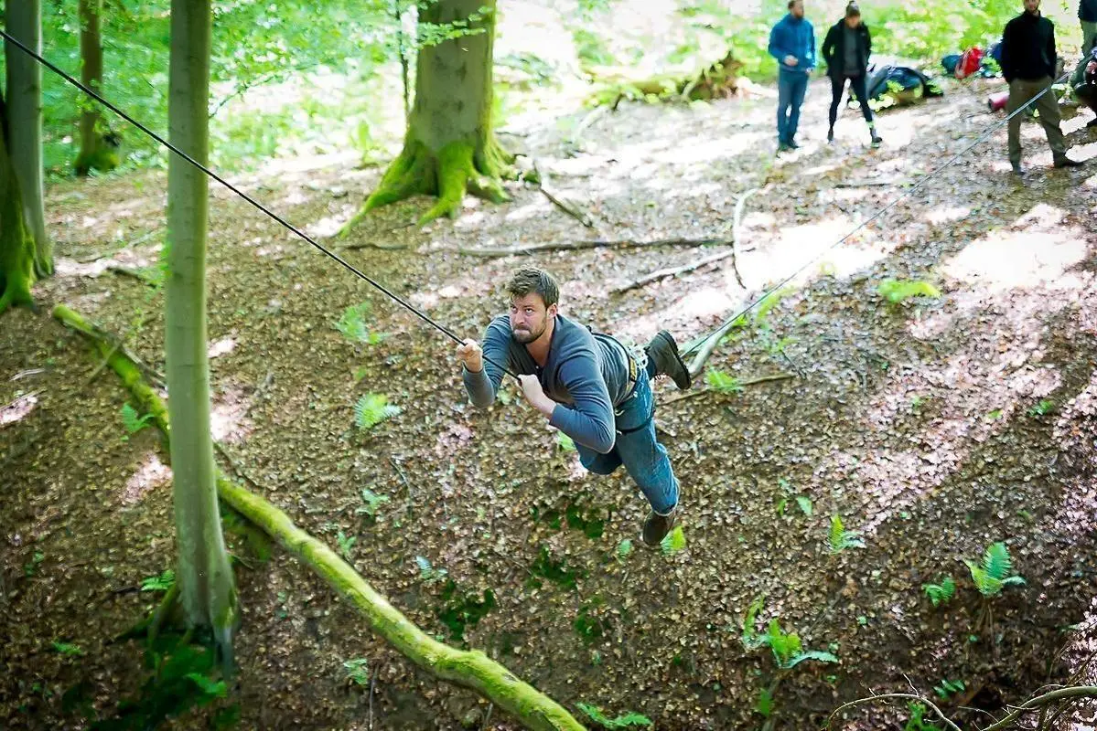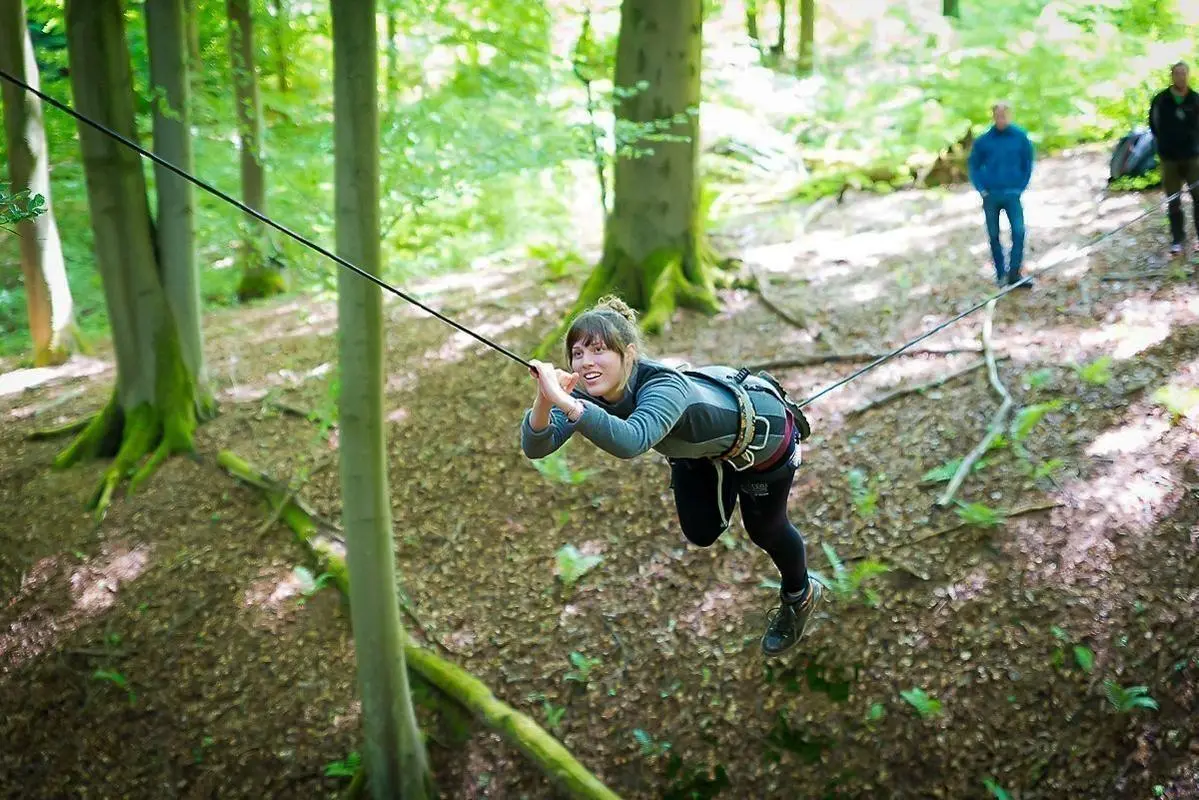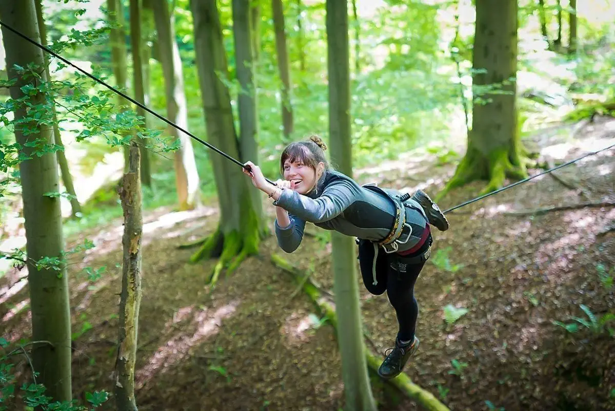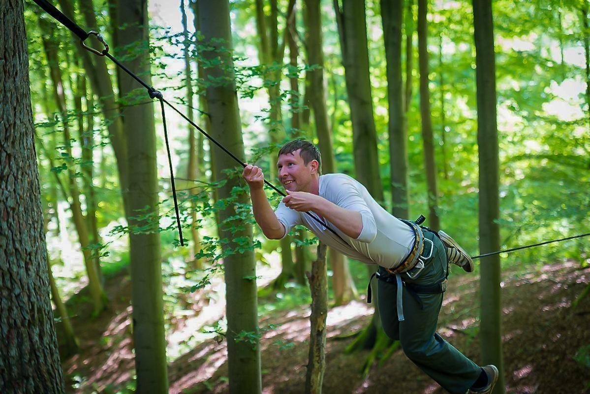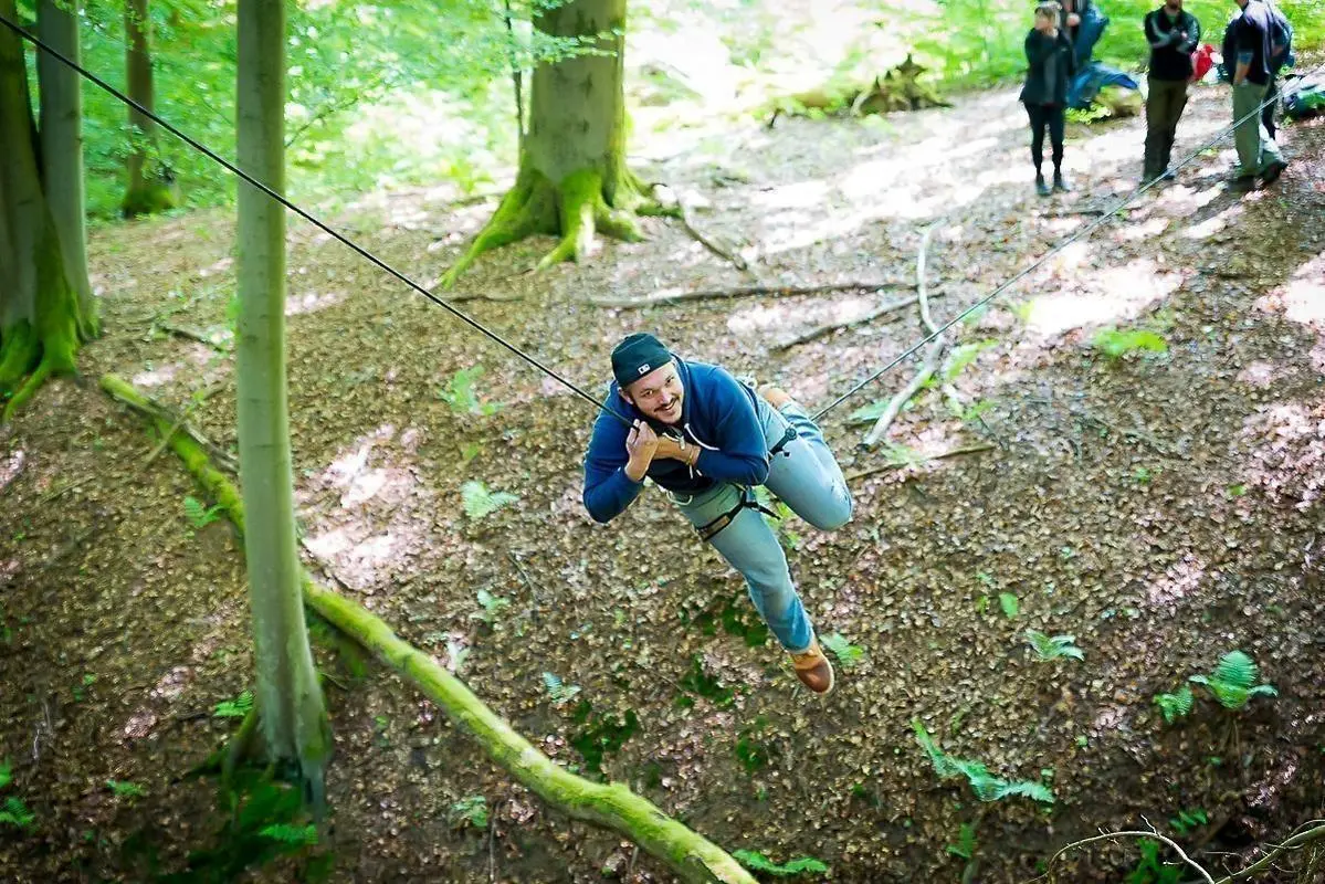 Selbstgebaute Seilquerung wird zwischen Bäumen überquert
