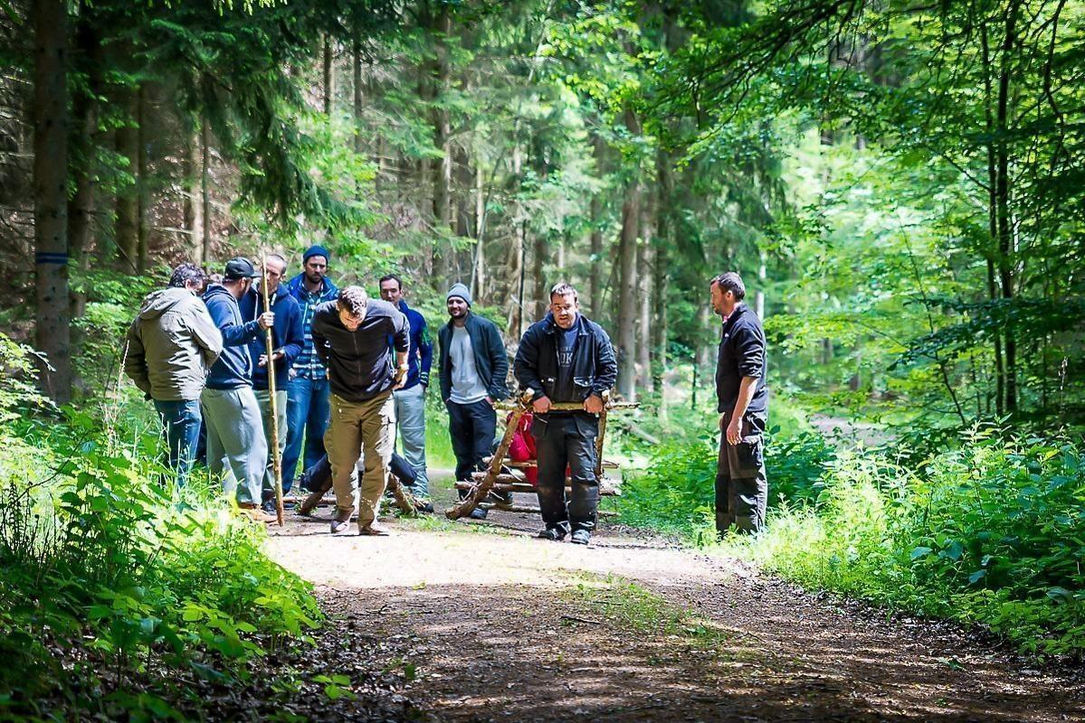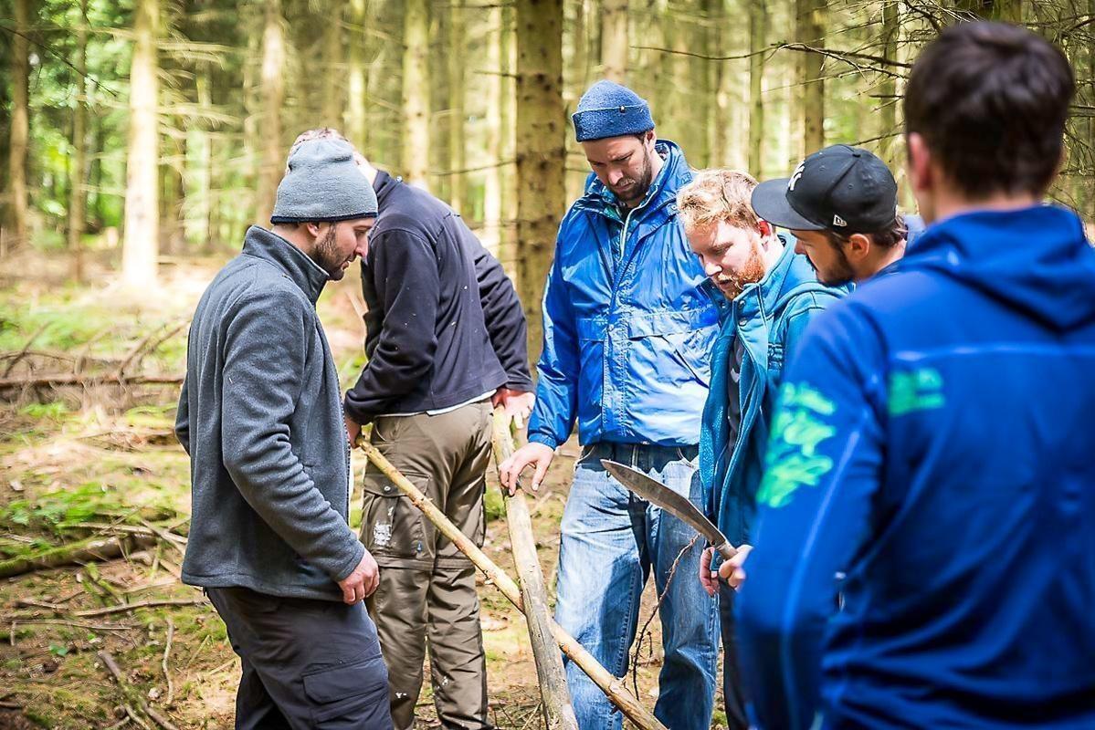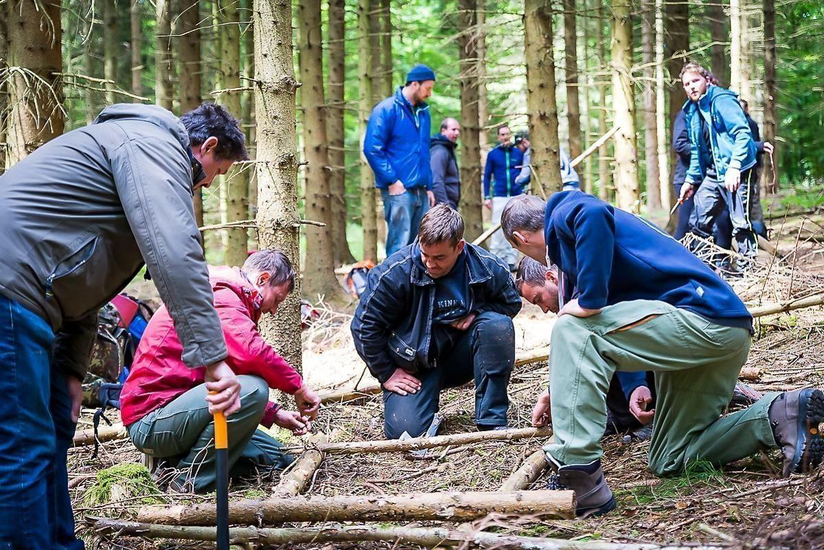 Gruppe arbeitet gemeinsam an einer Holzstruktur im Wald