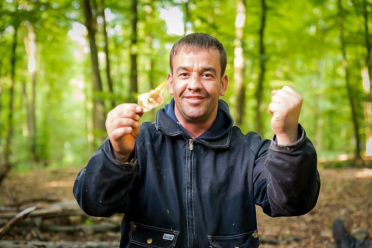 Nahaufnahme eines Mannes mit grauer Mütze und orangefarbener Jacke im Wald