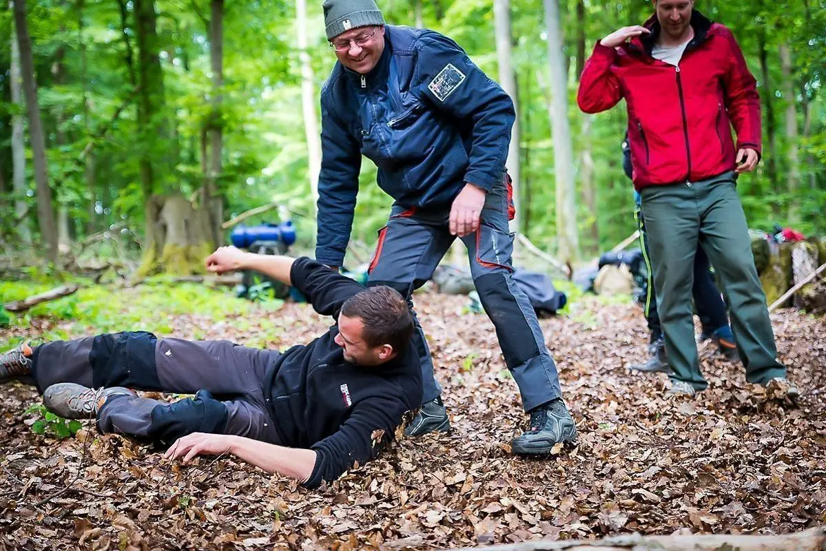 Zwei Personen üben einen Nahkampfgriff im Wald, während andere zuschauen