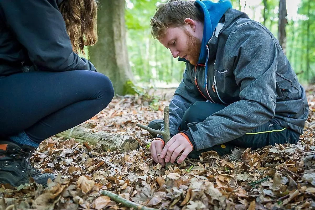 Zwei Personen untersuchen einen kleinen Stock im Laubboden des Waldes