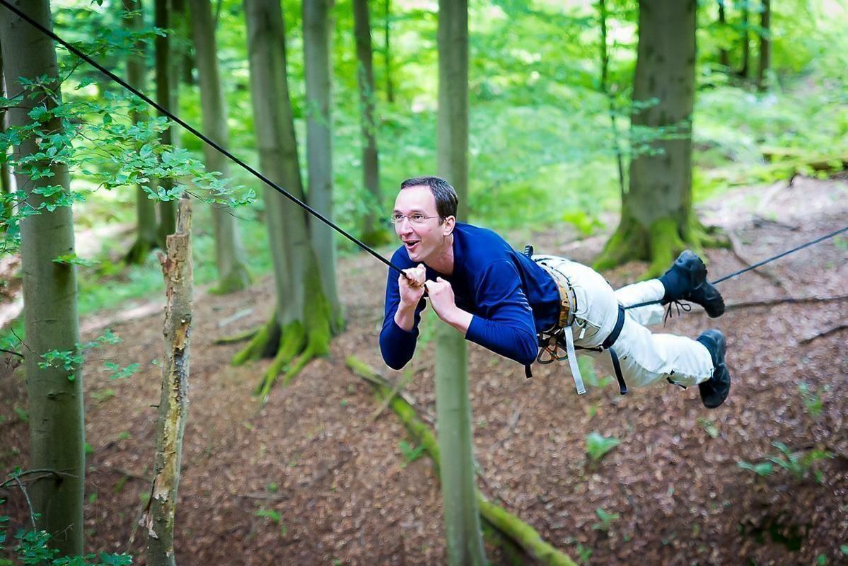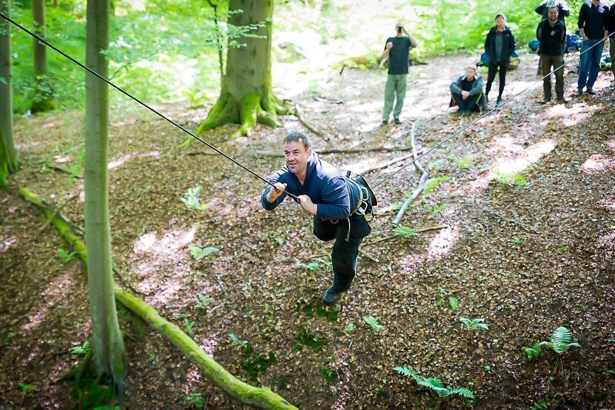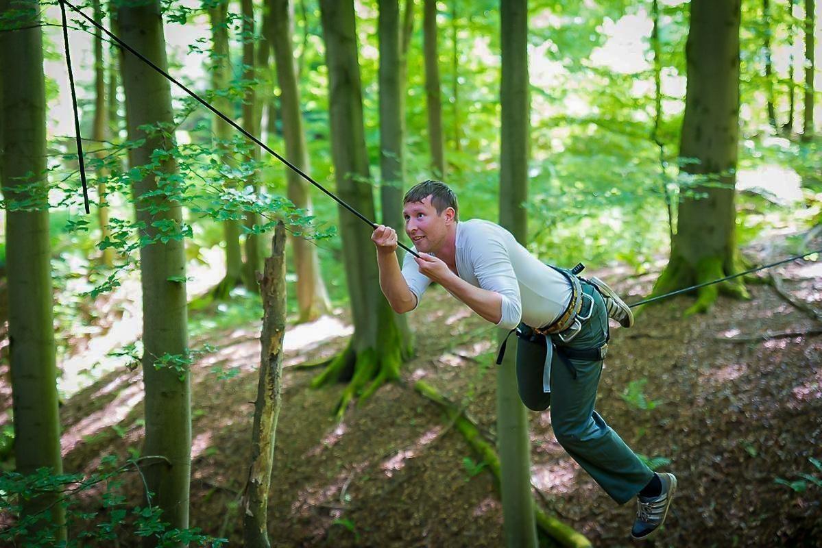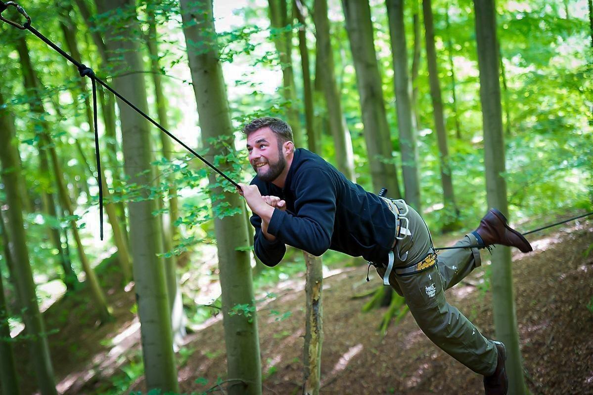 Teilnehmer überquert eine selbstgebaute Seilbrücke zwischen Bäumen